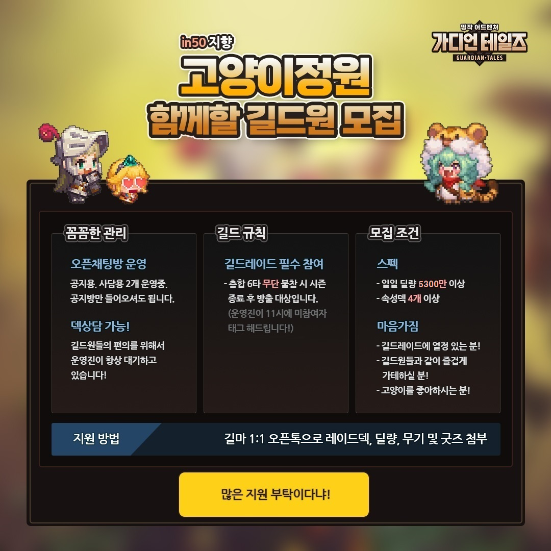 in50 지향 고양이정원 길드에서 함께할 길드원을 구하는 중이야...!