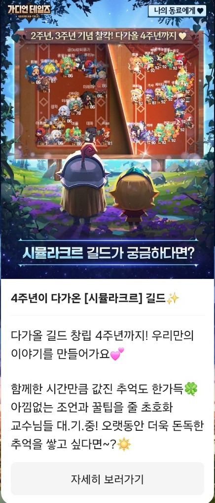 저희 '시뮬라크르' 길드는 가디언테일즈 출시일과 거의 비슷하며 롱런하고 있는 길드입니다.