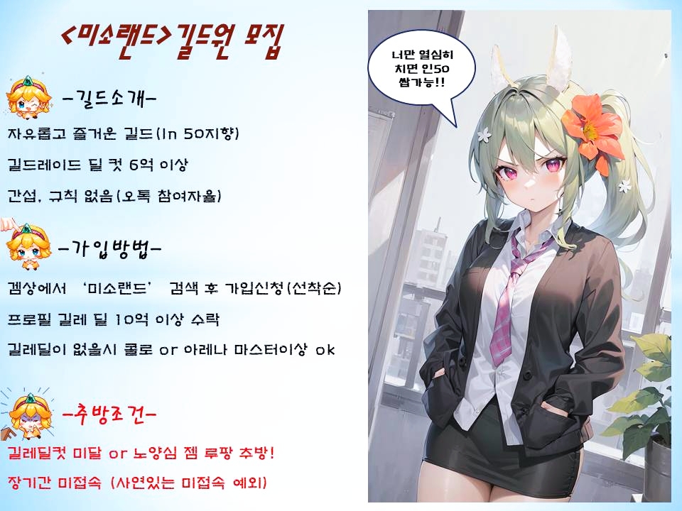 인50)미소랜드 길드원. 모집중(오톡자율.간섭없음) 작성자미소소|작성시간25.05.24|조회수35 목록 댓글 0 글자크기 작게가 글자크기 크게가 다음검색 현재 게시글 추가 기능 열기 북마크 공유하기 신고 센터로 신고 댓글 댓글 0 댓글쓰기 답글쓰기 댓글 리스트