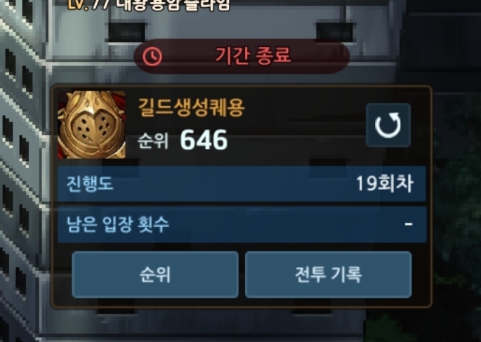 다음 길레 총!누적딜량 10만이하(뉴비분들 또는 바쁜 직장인 고려하여)나 2,3일미접이신 활동없으신분들은 정리해고..할수도있으나 맘약해서 못할수도 있으니 길드원 풀꽉되더라도 관심있으신분들은 댓달아주시면 감사하겠습니다. 게임내신청해주셔도됩니다!^^