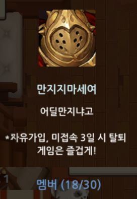 "만지지마세여" 길드원 모집합니당 작성자뉴비에양|작성시간21.04.10|조회수36 목록 댓글 0 글자크기 작게가 글자크기 크게가 만지지마세여 길드에서 길드원 모집합니당 뉴비던 고인물이던 모두모두 환영해용 가입조건은 없구 미접속 3일시 추방! 길레는 약해두 좋으니 같이 때려주시면 땡큐베리감사! 다음검색 현재 게시글 추가 기능 열기 북마크 공유하기 신고 센터로 신고 댓글 댓글 0 댓글쓰기 답글쓰기 댓글 리스트