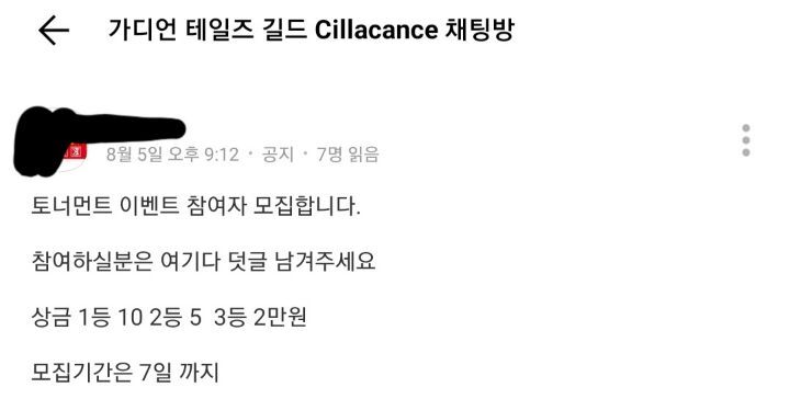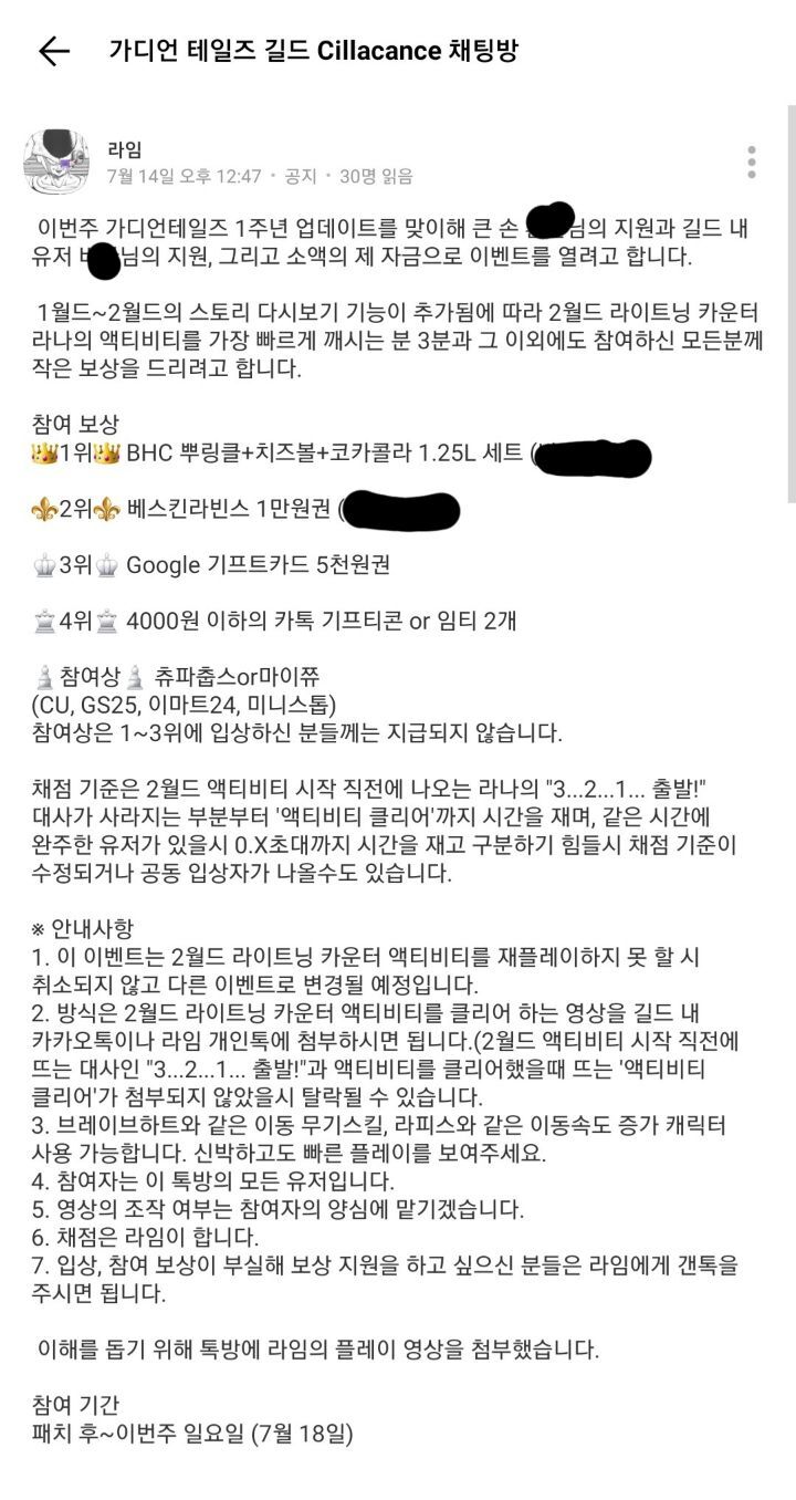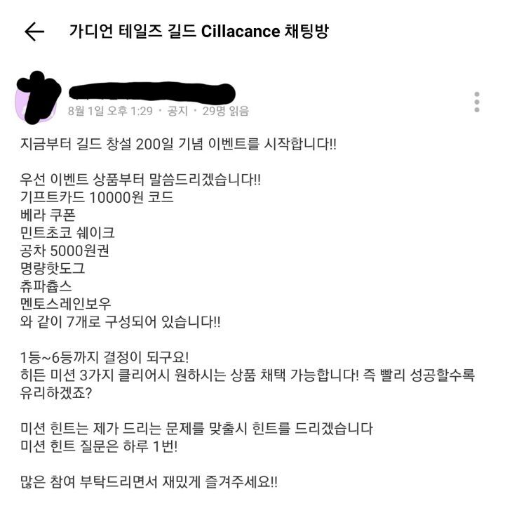 와 같이 톡방 운용을 통해 이벤트를 열고있는 "초명문" 길드다