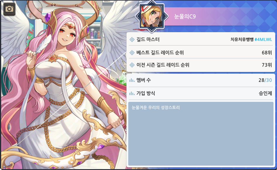 저번 길드레이드 73등한 눈물의C9 길드에서 같이 IN100을 유지하실 길드원 두 분을 모집합니다.