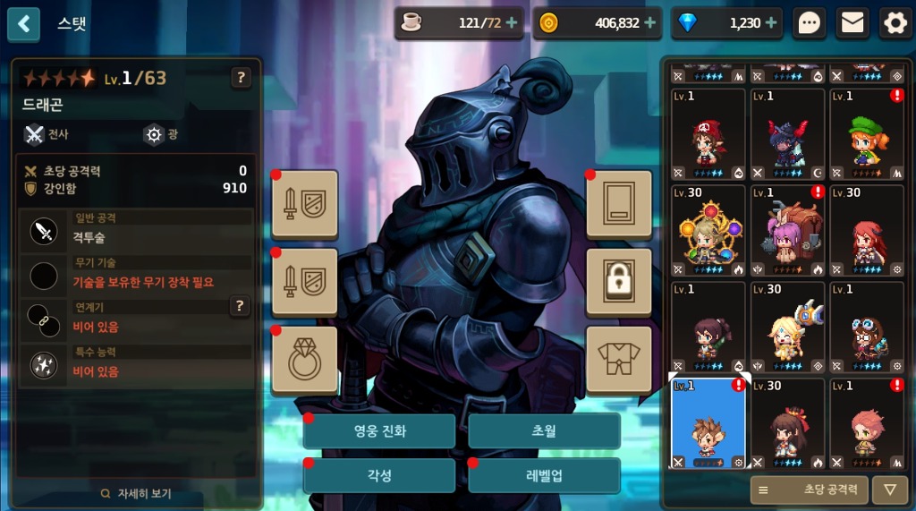기사 4성 60렙 각성 76/203 까지 뚫고 탱커로 앞에 세우고 잇지만 탱커역할도 못하고 바로 죽습니다