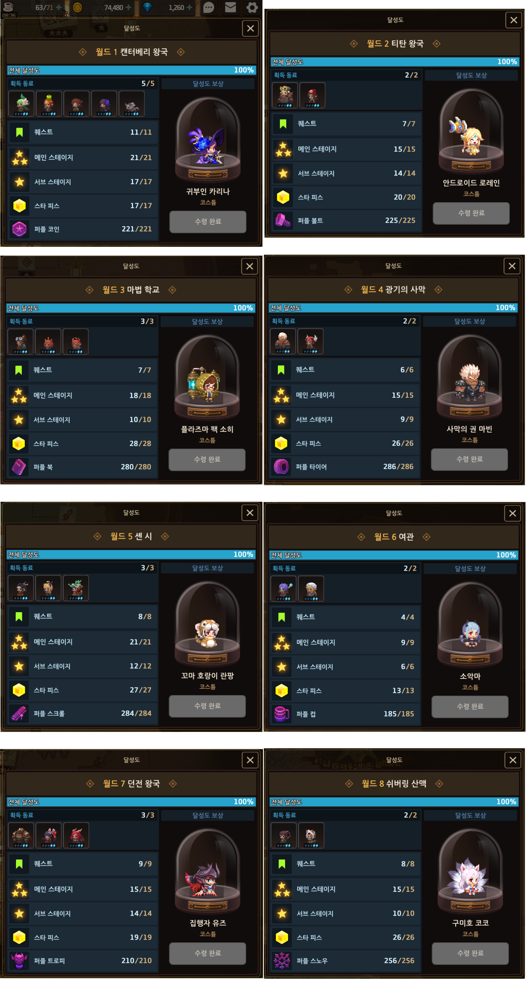 월드 8클리어 (서브 , 메인퀘스트 별3개 포함 ) - 1250개