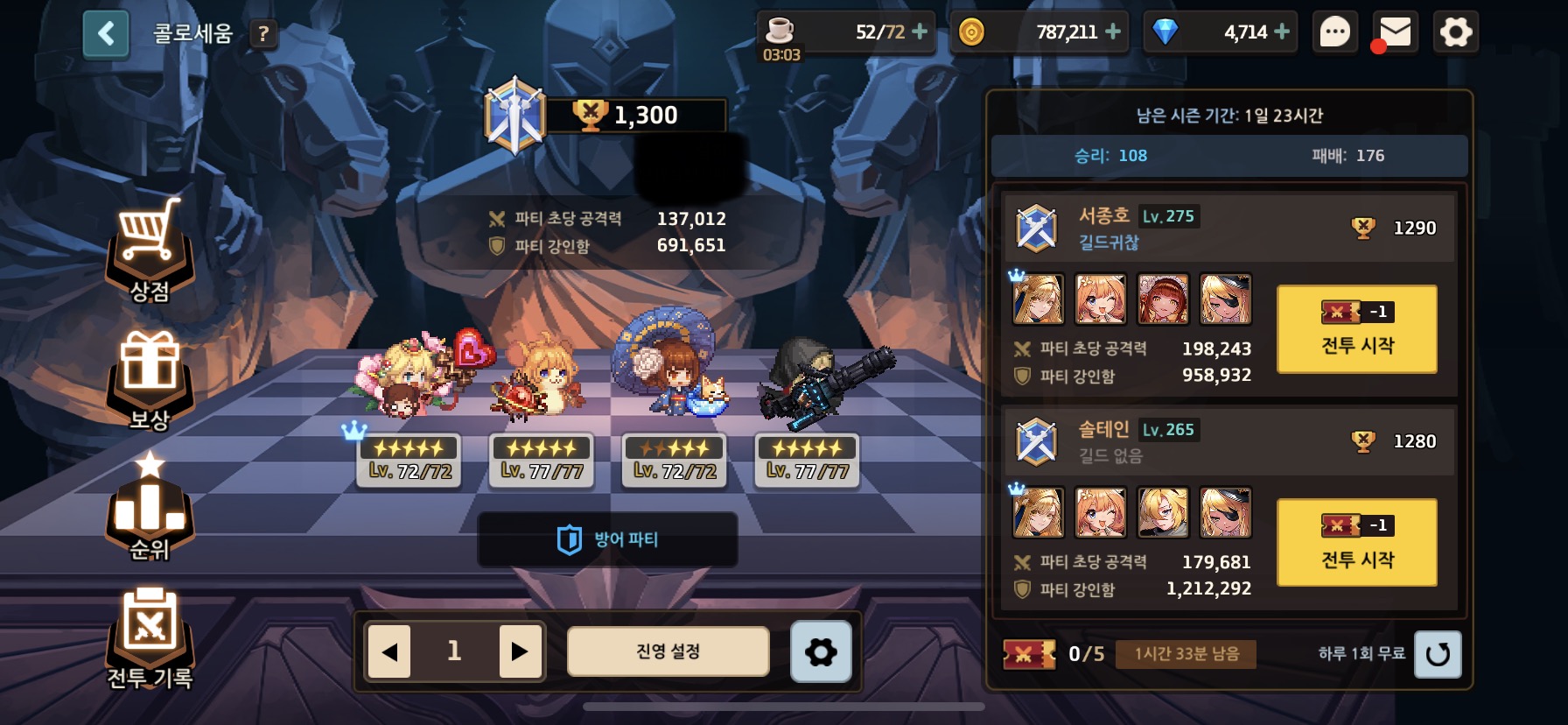 콜로/아레나 져도 아무 상관없다. 주간젬 보상을 받는 것이 중요하므로 무조건 최대한 참여해야한다. 어차피 스펙 오르면 나중에 승급하게 돼있으니 등급은 신경쓰지마라