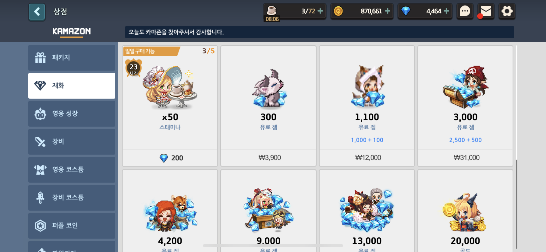 60 진던 이상을 돌 수 있게 된다면 상점에 가서 스태미나를 구입한다. 하루에 2번(250젬)까지 구입하는것이 성장에 효율적이다. 그 이상은 효율이 떨어진다.