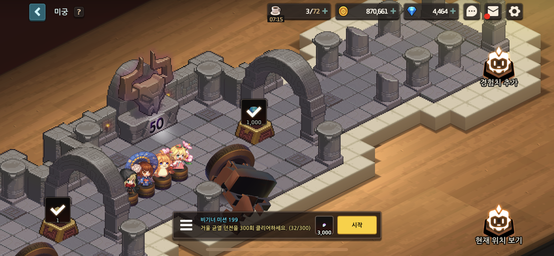 스토리가 막힐때는 '균열' 탭에 있는 미궁을 조금씩 클리어해준다. 커피, 젬처럼 중요한 재화들을 얻을 수 있어서 향후 스펙업에도 도움이 된다.