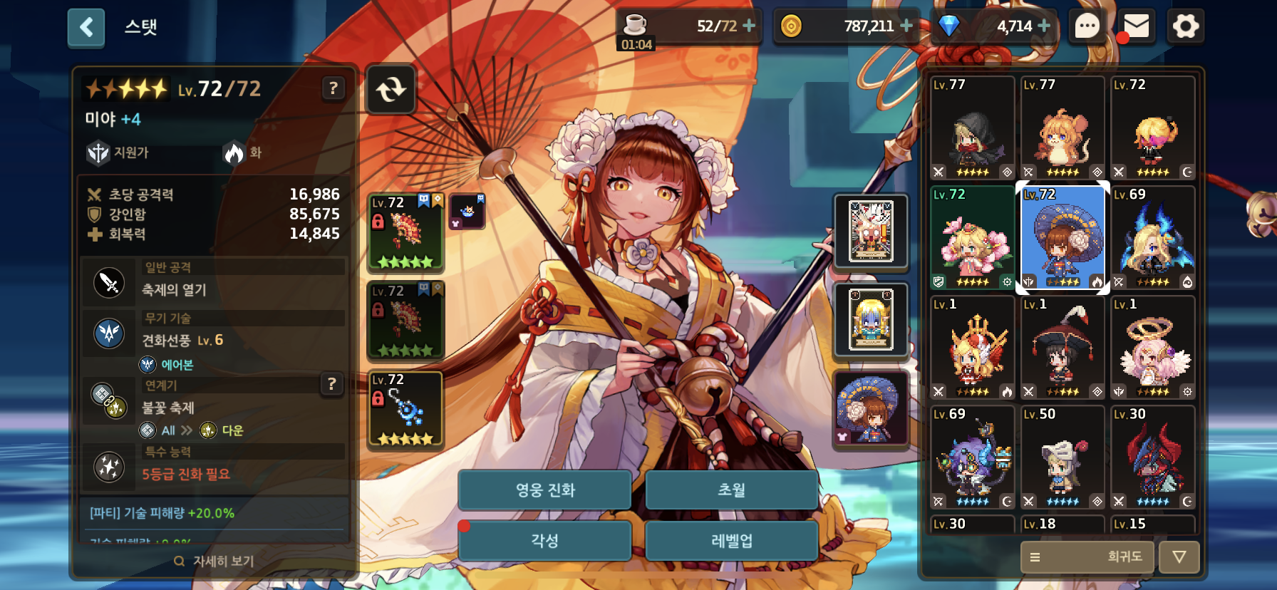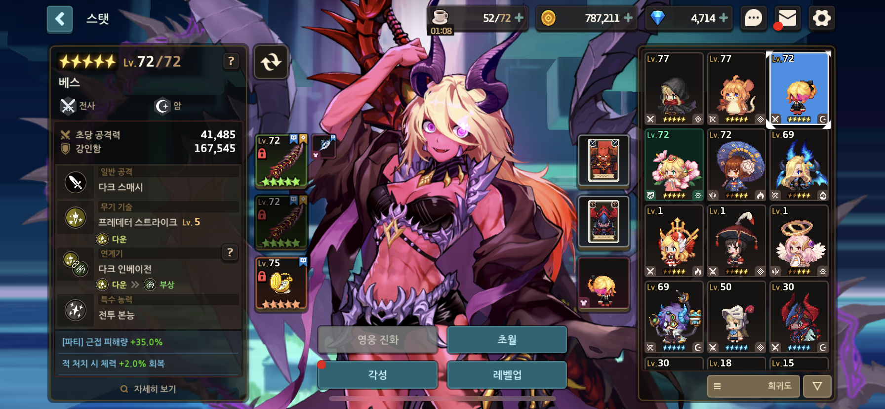 가장 먼저 키울 3성 영웅을 정했으면 그 영웅에게 각성석을 우선적으로 투자하도록 한다. 나머지 영웅들은 연계기만 활성화 시켜주고 최대한 아낀다.