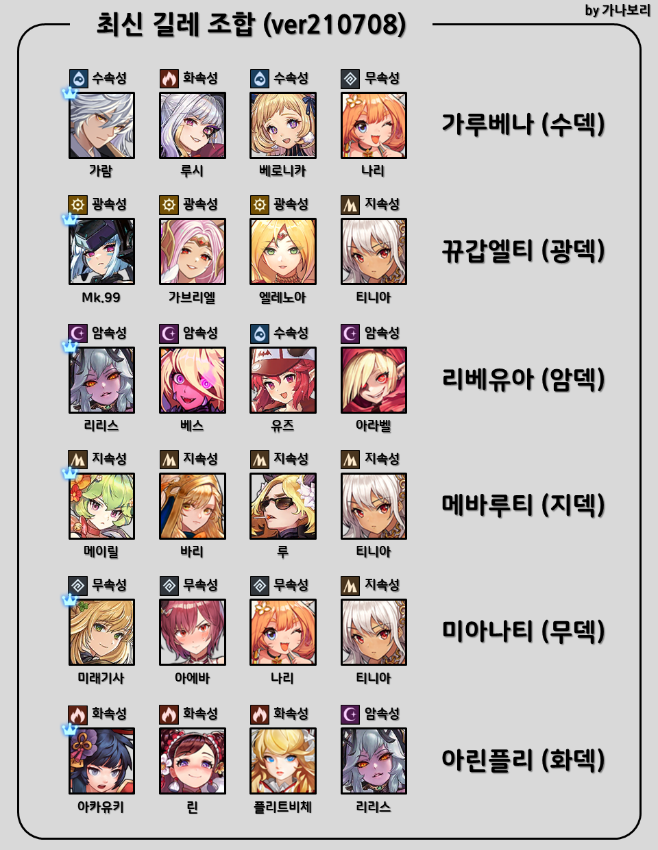 현 버전(2021년7월1일 업데이트 기준, 사진 오타입니다) 기준 속성별 최종 형태의 조합입니다. 나리, 티니아 같은 경우는 많이 겹쳐있는데, 길레 티켓은 하루 3장이기 때문에 상황에 따라서 이곳저곳 붙여서 사용한다고 보시면 되겠습니다. 길레 고득점을 노리신다면 여기에 나와 있는 조합을 구성하는 것으로 목표로 영웅을 육성하면 되는데, 속성별로 덱파워가 다르기 때문에 현 시점에서는 수덱, 광덱, 암덱을 3가지를 맞추는 것이 시간대비 가장 높은 딜량을 뽑아낼 수 있습니다. 여기에는 크게 2가지 이유가 있습니다. 첫째는 수광암덱은 현재 완성된 조합이 아님에도 다른 조합 대비 딜이 좋다는 것과 두번째는 리더만 키워도 딜이 어느정도 나온다는 것에 있습니다.
