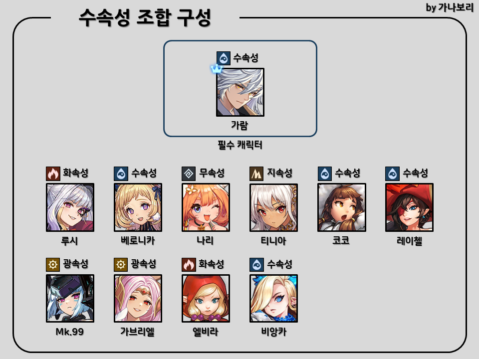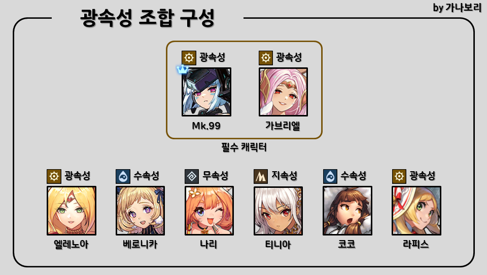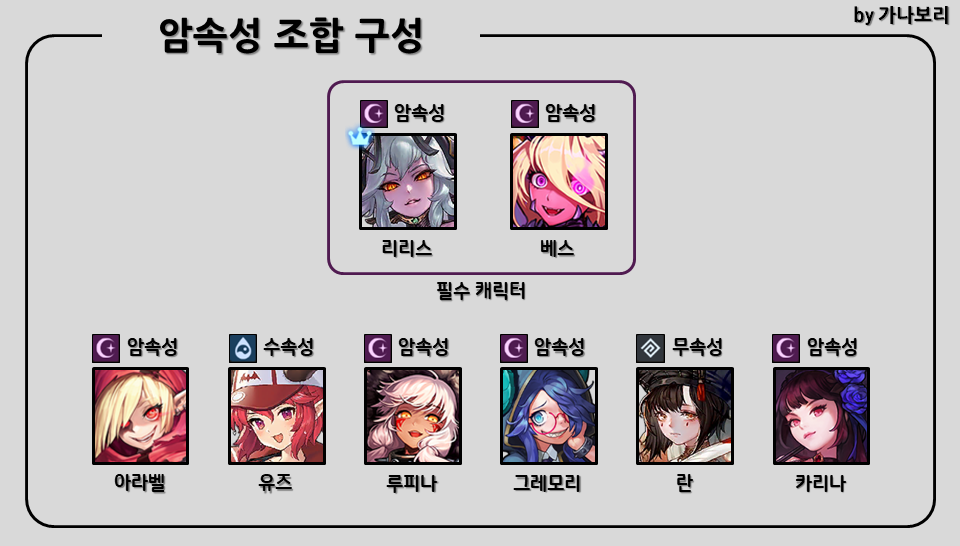 암속 보스가 없고 나리, 티니아가 다른 곳에 쓰일 때, 뀨와 가브리엘을 같이 사용합니다. 이 공략 글에서는 뀨, 가브가 1군 고정되어서 쓰실 일은 없겠지만 이러한 형태도 있다는 것을 알아두면 좋을 것 같아서 추가했습니다.