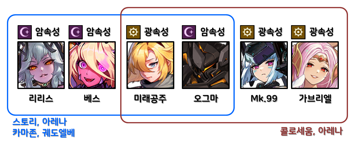 여기서 핵심은 뀨, 가브리엘, 리리스, 베스 육성에 있습니다. 길레 입문 전에 뉴비분들이 많이 육성하는 미래공주, 오그마와 조합하면 다양한 컨텐츠 소화가 가능해집니다. 따라서 이 4개의 영웅 위주로 육성을 진행하면 스토리, 아레나, 콜로, 카마존, 궤도엘베는 물론 길드레이드까지 챙길 수 있습니다.