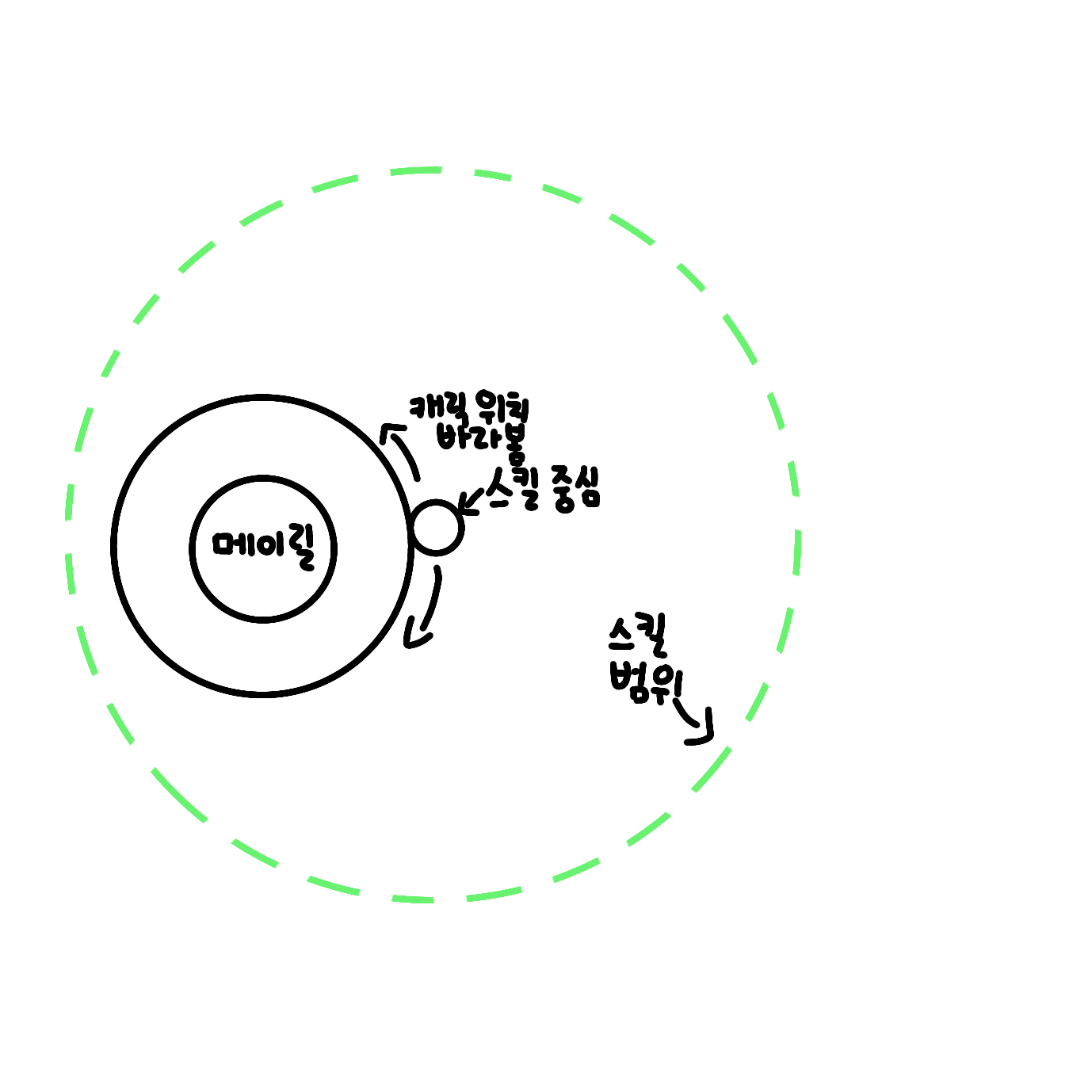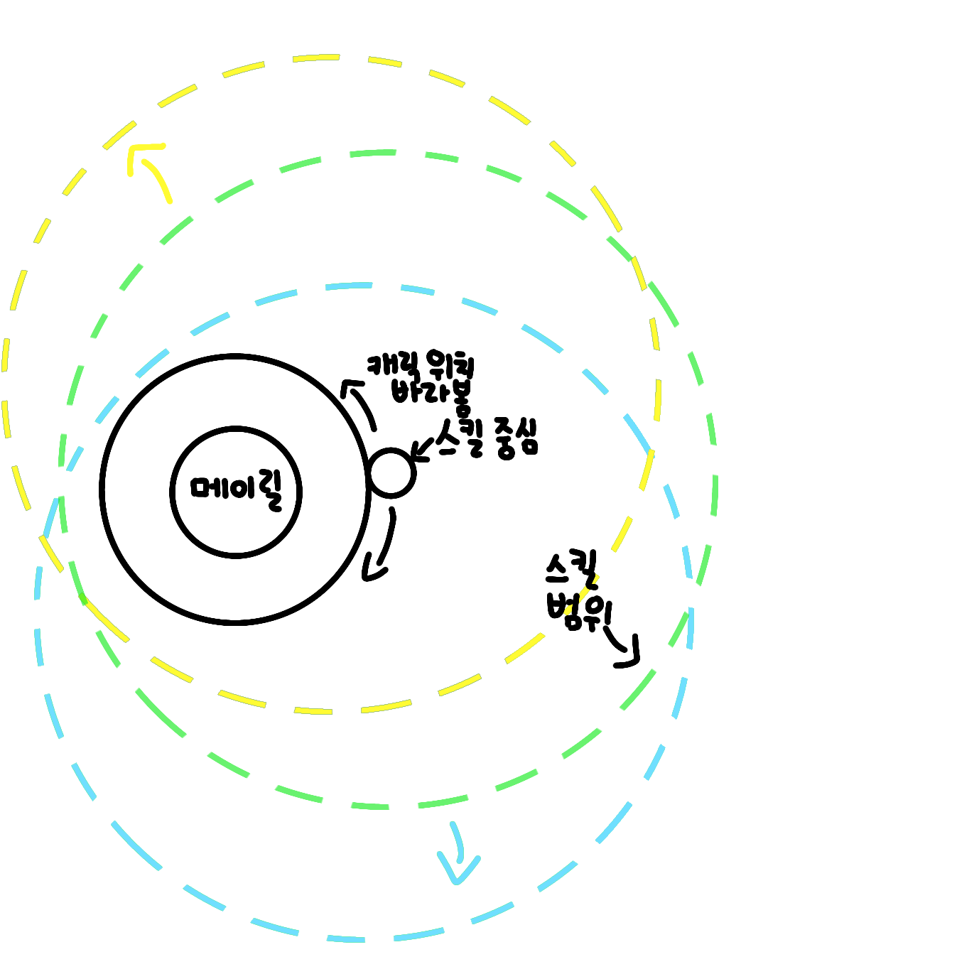 1. 메이릴의 스킬 메커니즘은 위의 원 주위에 스킬의 중앙이 초기에 생성되고, 약 0.3초간 캐릭터를 메이릴의 원 주위간격으로 바라보다가 생성되면서 총 3타를 날리는 기술입니다.