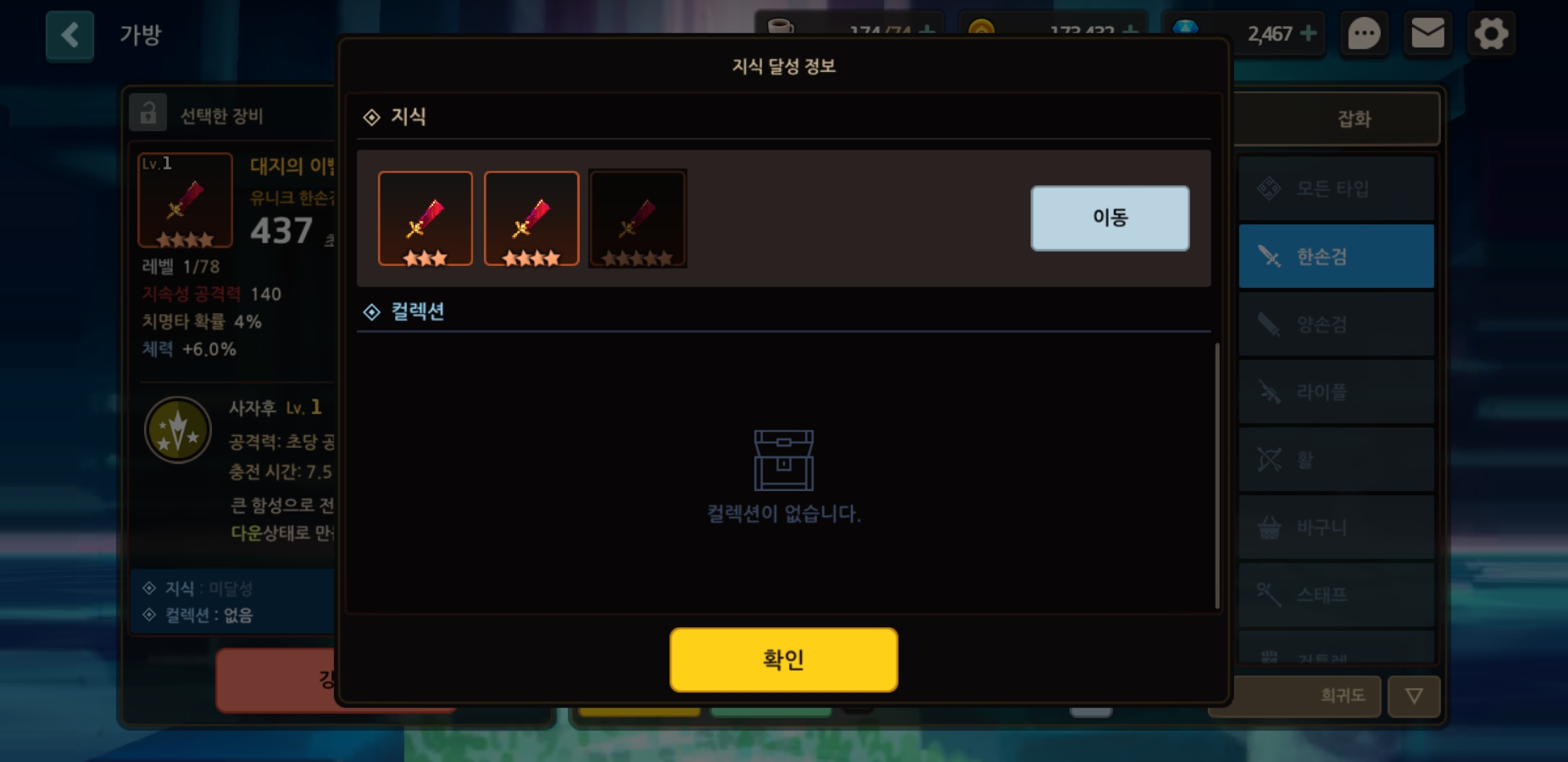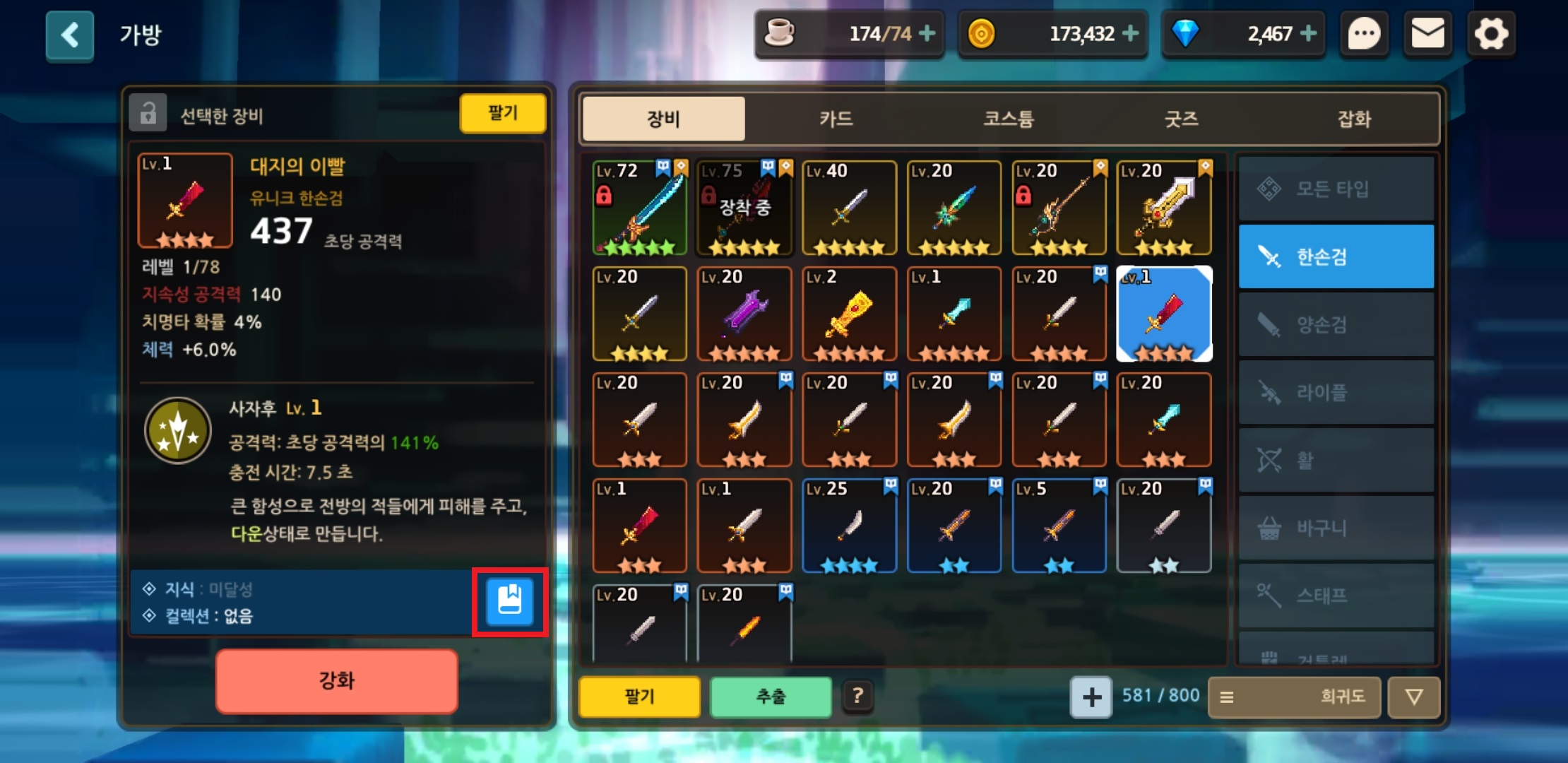 이런 경우엔 미련 가지지 말고 다른 장비(서브 영웅들의 무기)를 도감작 해주면 된다.