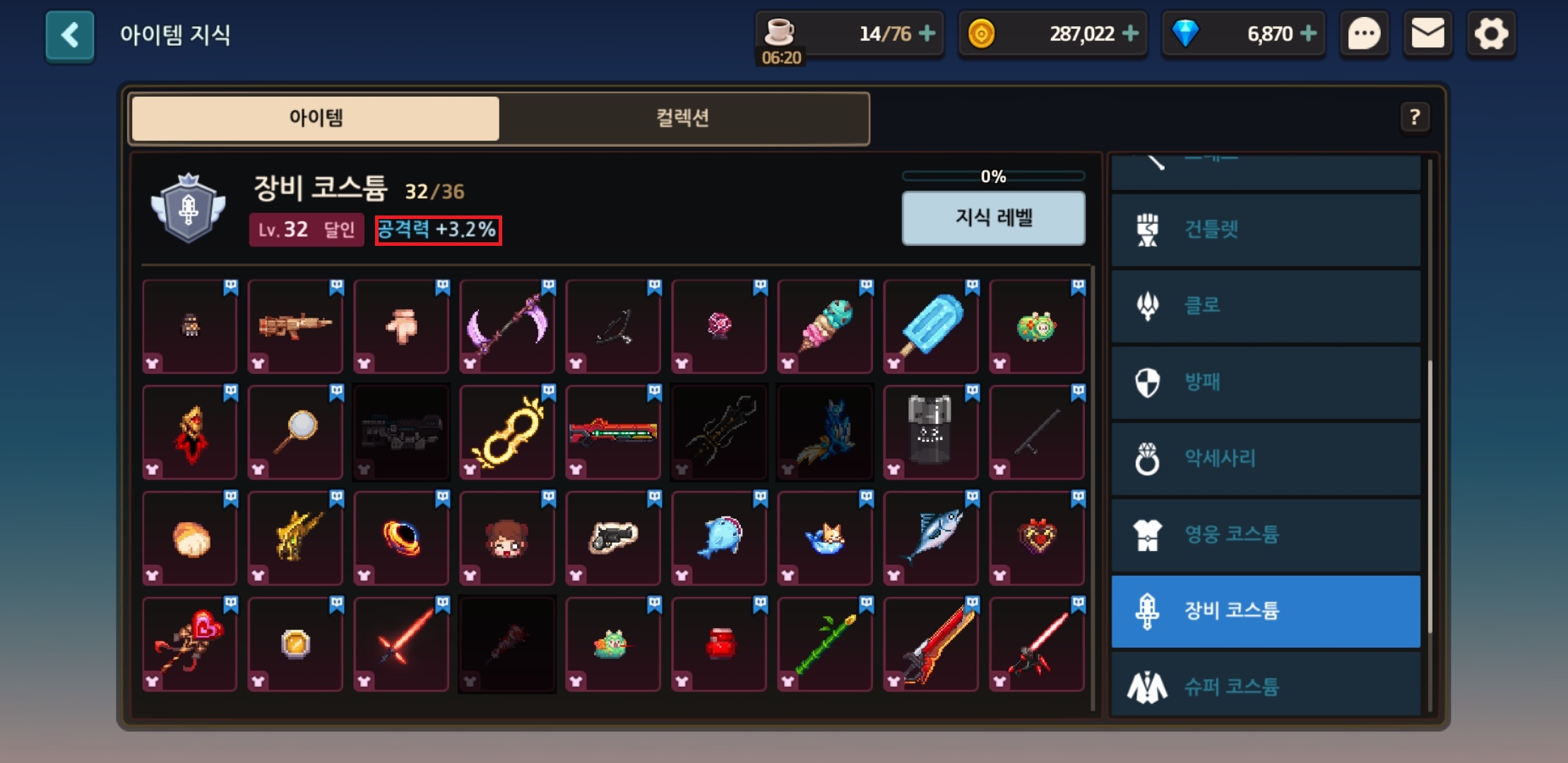 1.뉴비라면 남는젬으로 '무기 -> 원하는 코스튬 -> 300젬 -> 컬렉션' 순서이다.