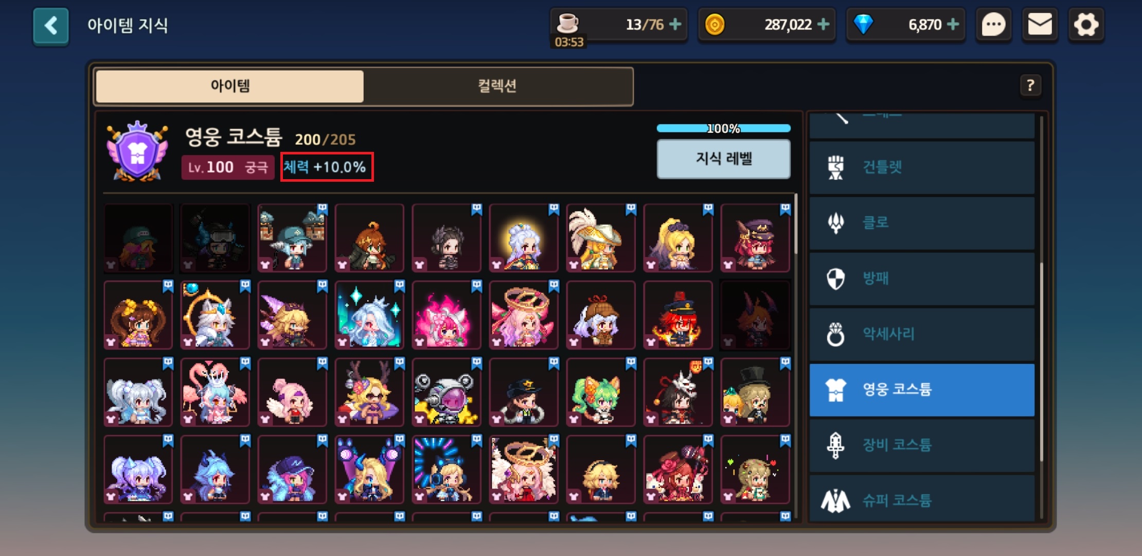 (영웅 코스튬의 첫번째 목적은 체력 +10% 이다. 개당 0.1%이며 총 100개를 사는 것이 목적이다.)