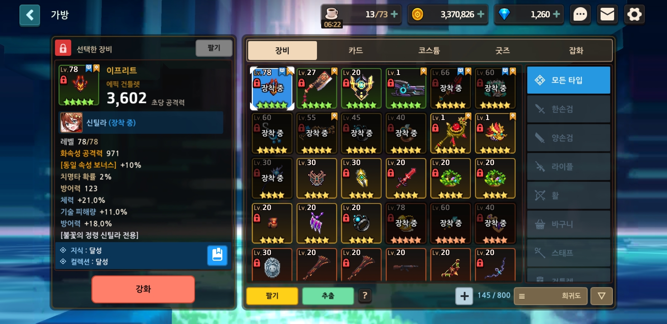무엇보다 빠르게 진화석 던전 소탕을 위한 가디언레벨51 달성을 위해서는 이 레어 영웅-전무 세트가 큰 몫을 합니다.