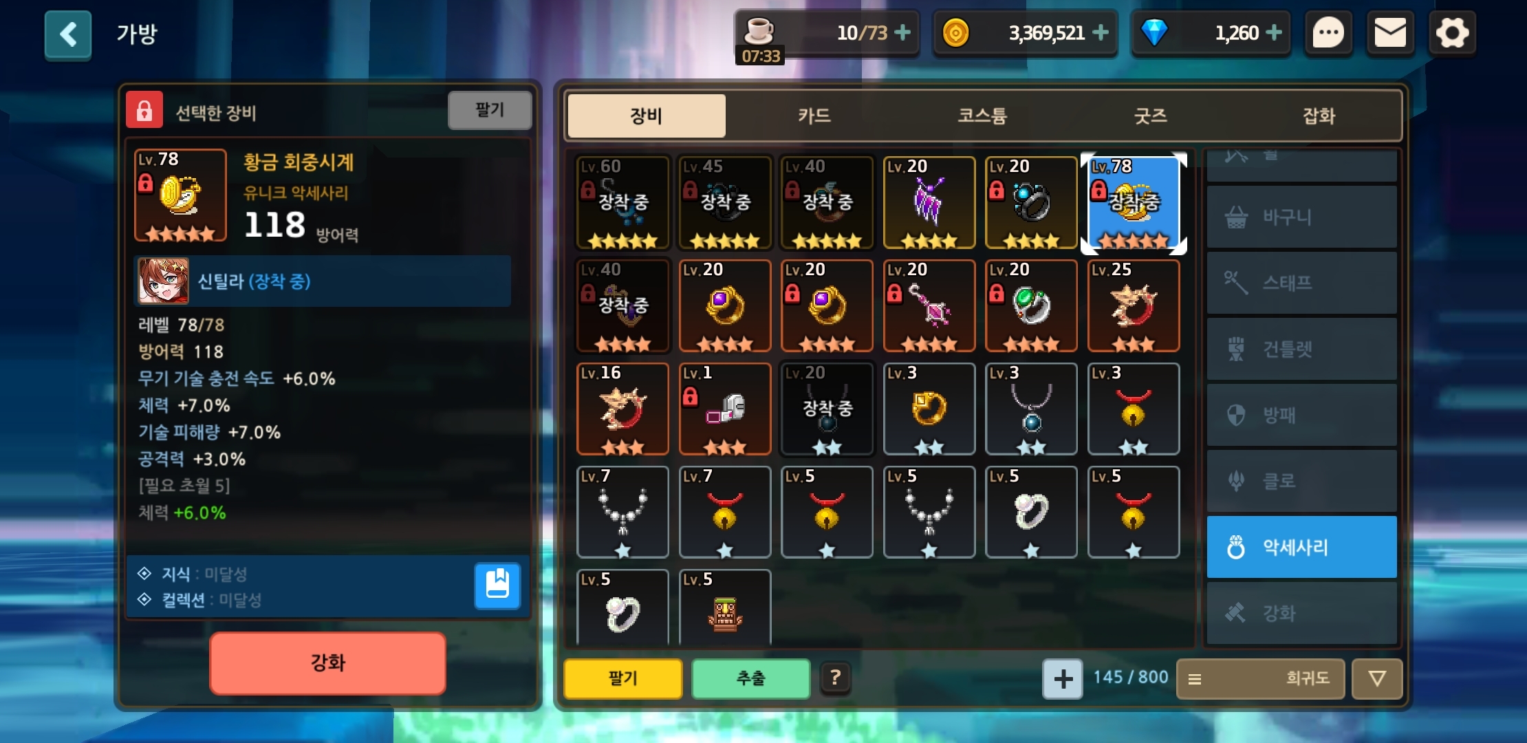 일단 지금 가디언테일즈를 키고, 별 4개가 달려 있는 아이템과 랩40이 넘어가는 아이템은 잠그고 옵시다.