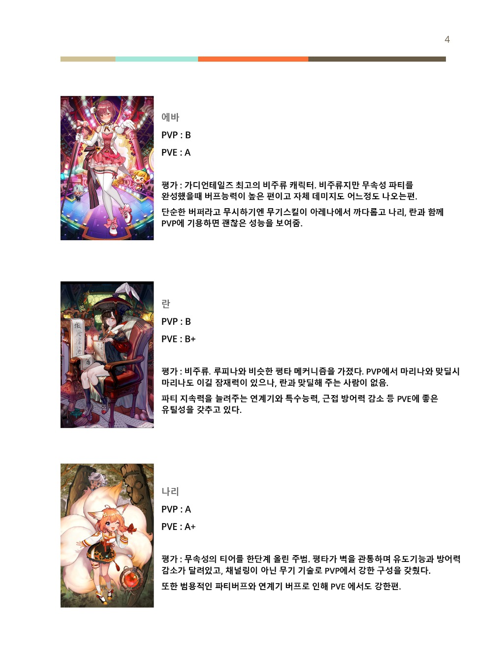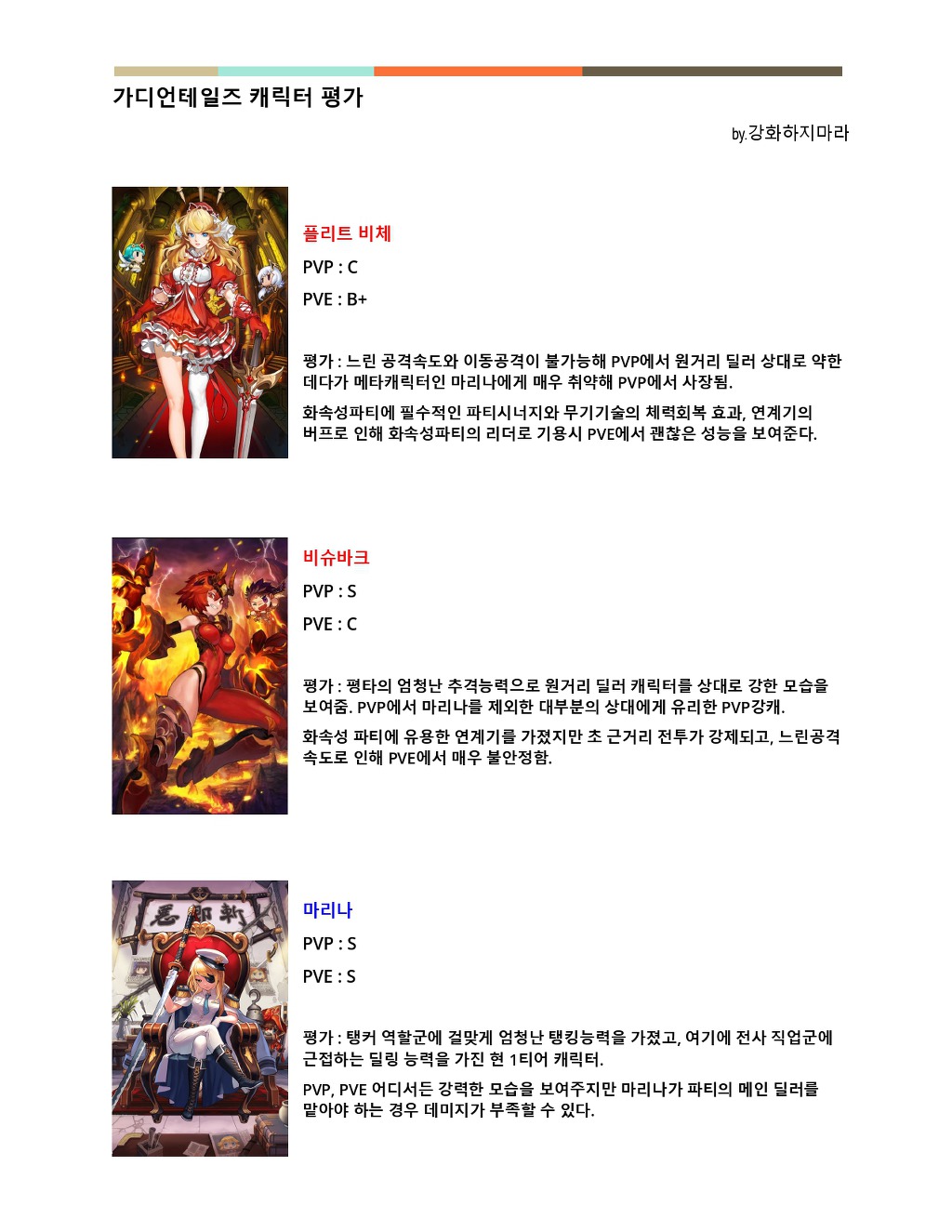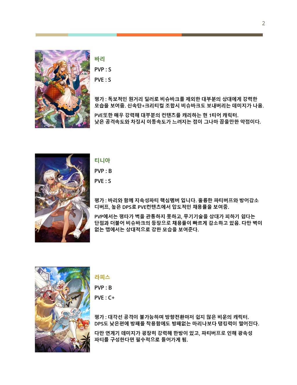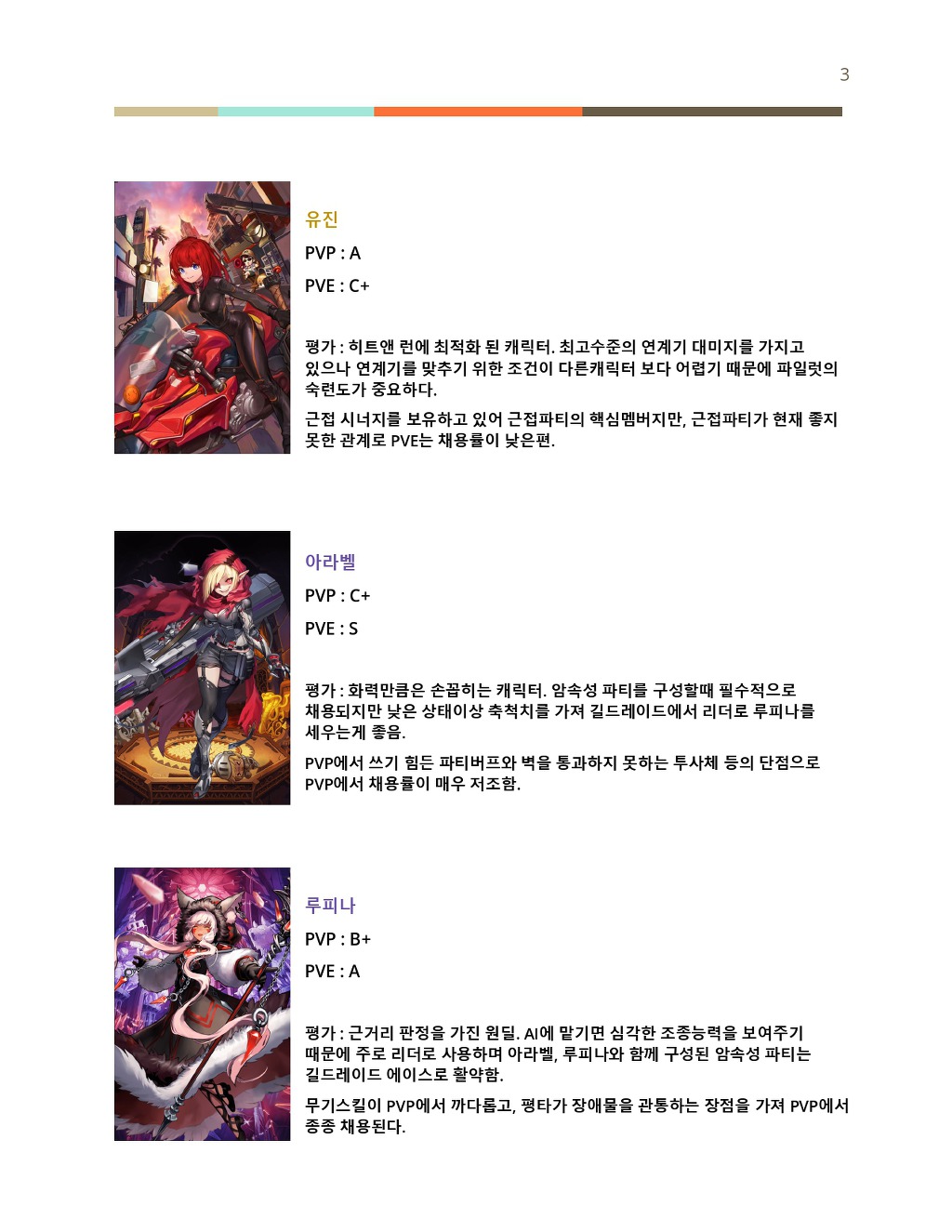 출시 직후에 비해 현재 캐릭터들의 평가가 많이 변해 현존하는 3성 캐릭터 평가를 작성하게 되었습니다.