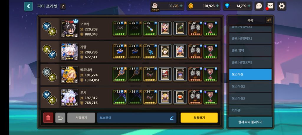 지금 현재 보스러시 순위권를보면 대부분의 유저분들이 같은 조합 혹은 거의 비슷한 조합으로 보스를 공략하는걸 볼 수 있습니다.