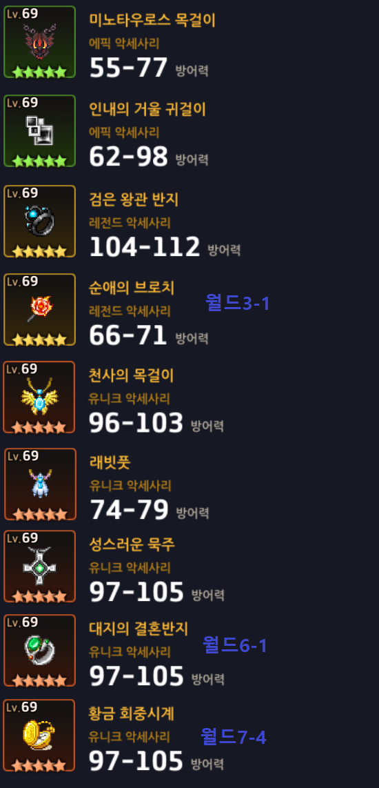 스토리 미는 중에는 방패와 악세사리가 별로 큰 영향을 주지 않기 때문에, 구하기 어려우시면 대충 아무거나 쓰셔도 무방합니다.