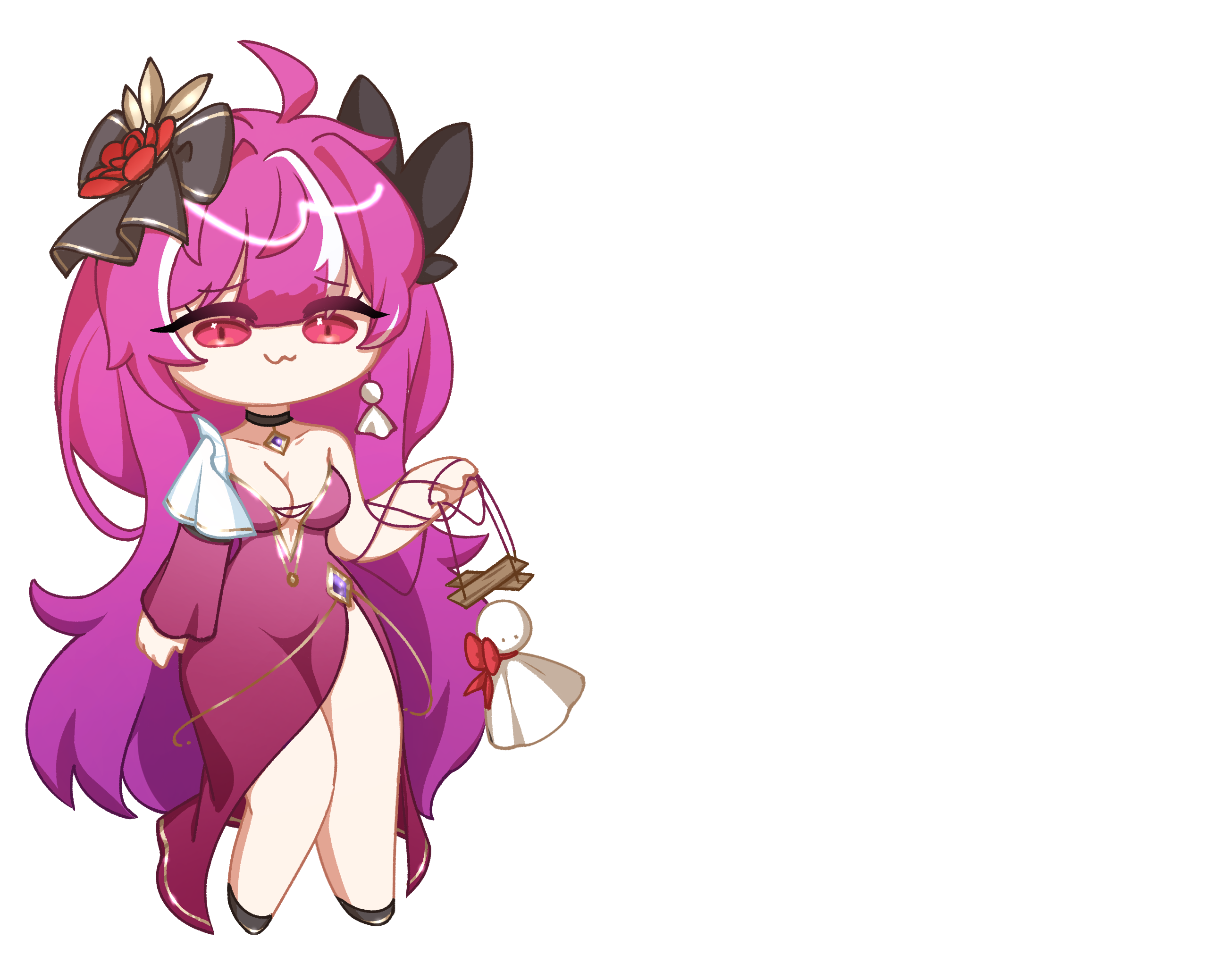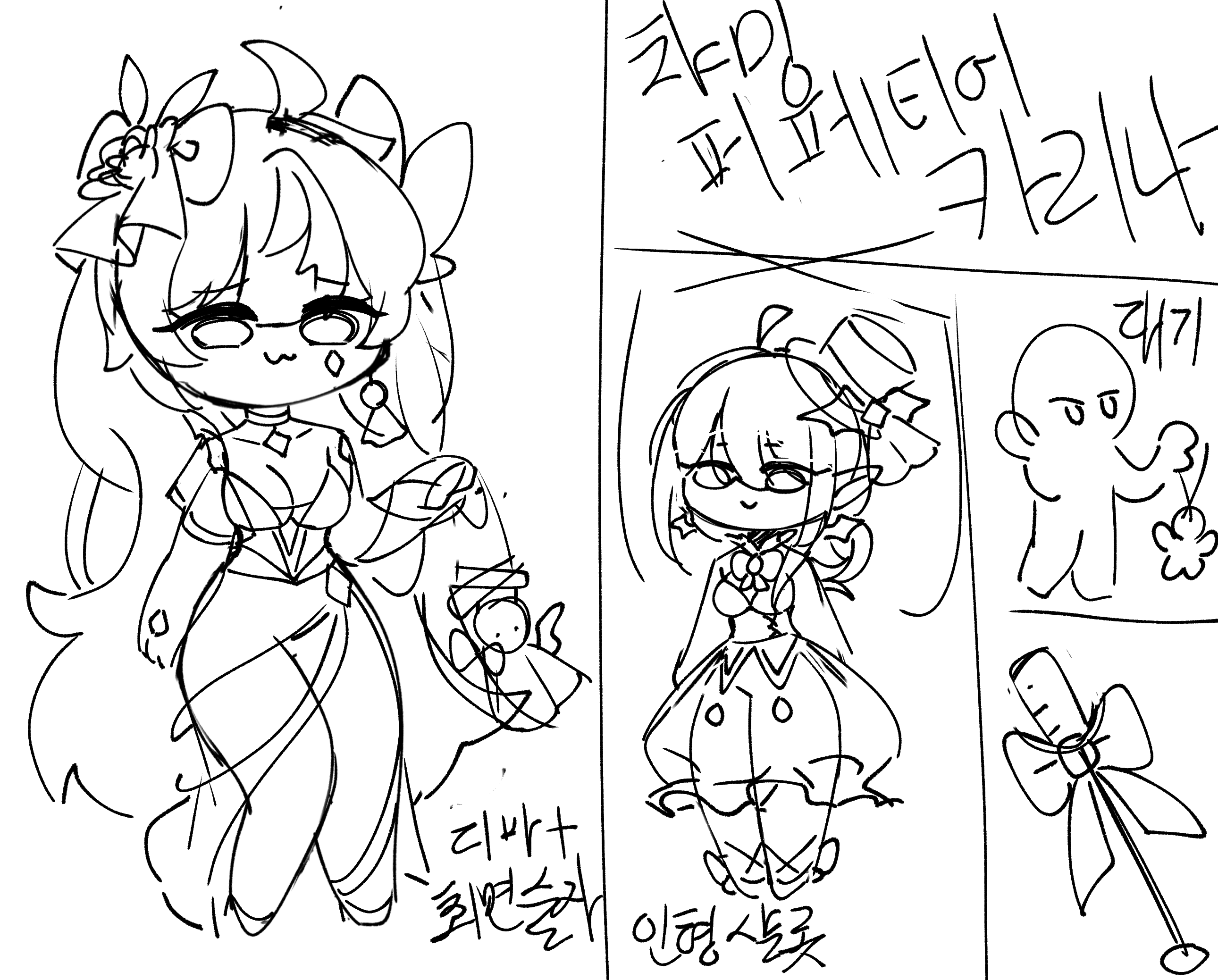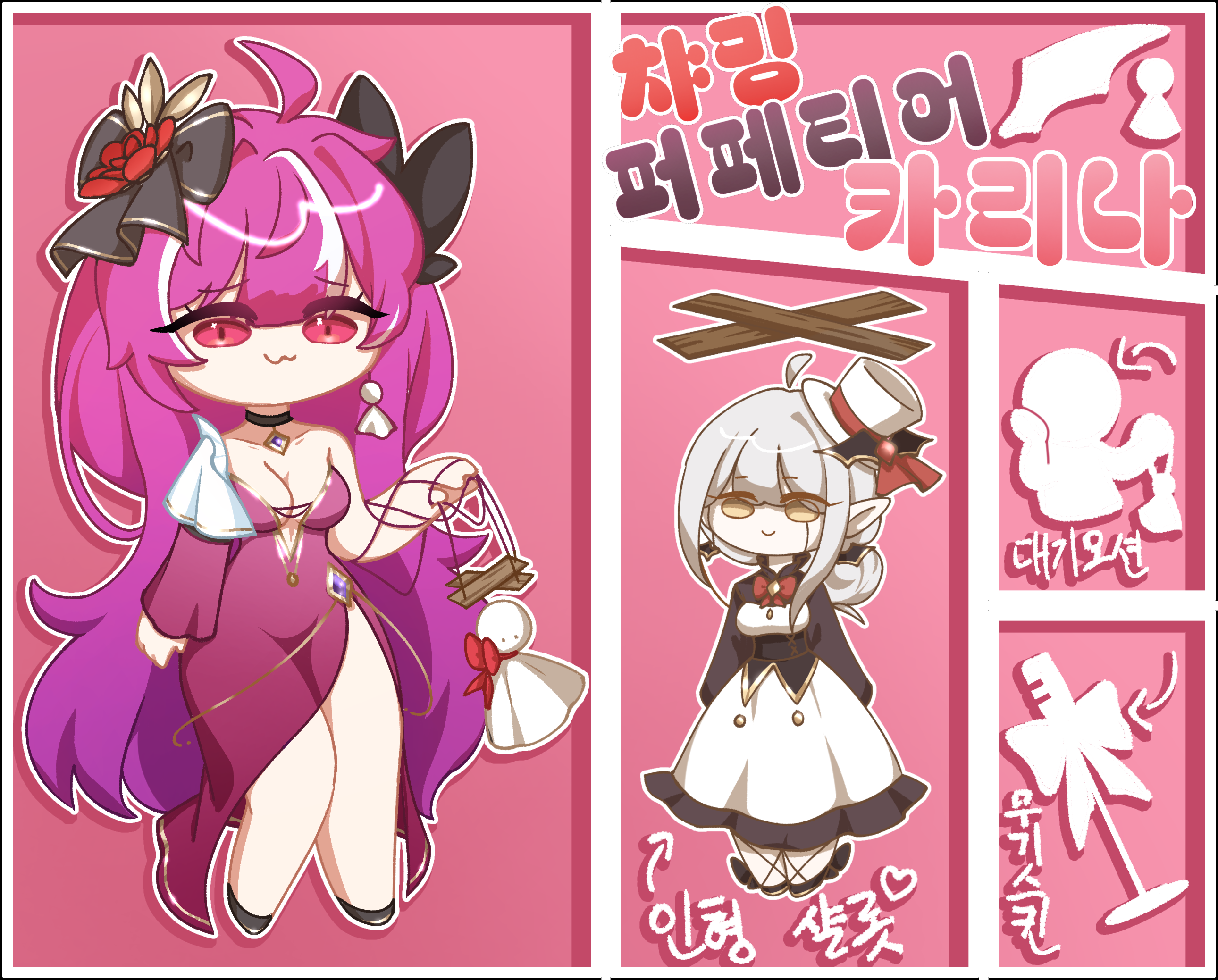 상세설명: 옷의 디자인은 인형술사+디바+최면술사 키워드를 잡고 하였으며, 기존 카리나의 머리장식과 카리나의 머리색과 어울리는 색상의 파티 드레스, 어깨장식을 달고있고 인형모양 귀걸이가 있습니다.