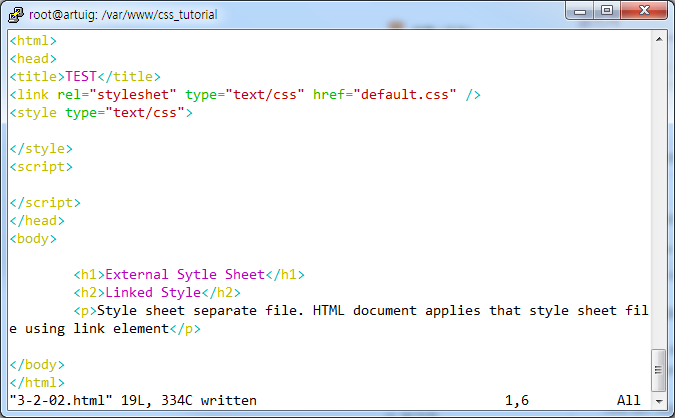head 태그의 link 태그를 보면 링크시킬 파일을 default.css 라고 지정한 것을 알 수 있습니다. 문서와 스타일시트가 동일한 디렉토리에 있기 때문에 파일명만으로 지정할 수 있는 것입니다. 이렇게 HTML 문서와 분리하여 적용하는 경우 외부 스타일시트를 한 번만 다운로드하면 캐시에 저장되어 웹 페이지 로딩 속도가 빨라지는 효과가 있습니다.