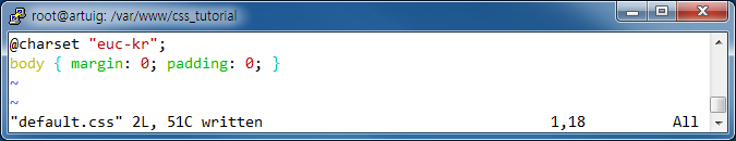 첫 줄의 @charset "euc-kr"는 문자 코드 세트를 선언한 것입니다. 다음은 이 default.css 스타일시트를 link 태그를 이용하여 포함시키는 소스입니다.