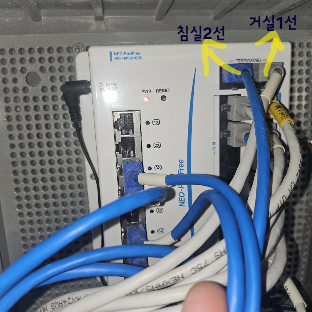 작성자선관위_민수(109동1202호) 작성시간 25.12.19 아니면 거실2 회색이나 거실1 회색선 입력쪽에 하나하나 꼽아 보시면서 인터넷 메인 입력선을 먼저 찾으면 될거 같아요 출력쪽에는 작은방2 계속 꼽아 놓은상태로 테스트 해보시면 될거 같아요