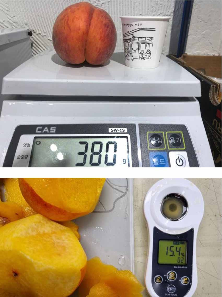 조생종 황도 7월중하, 대과종300~350g, 14~15bx