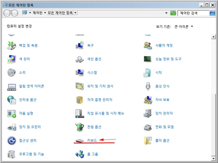 제어판 큰 아이콘으로 보기 기준입니다 키보드를 눌러줍니다