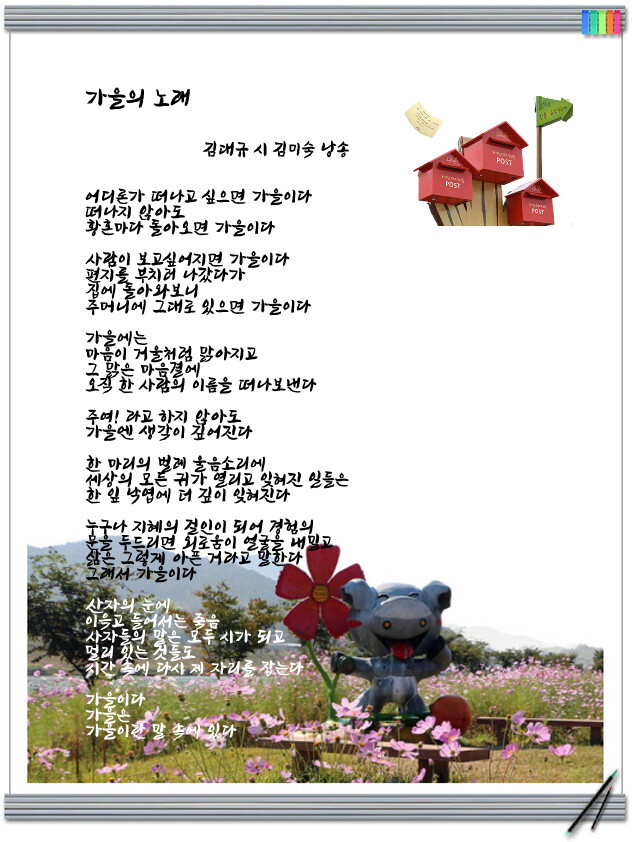 [스크랩] 가을의 노래 / 김대규 시 김미숙 낭송 작성자연동|작성시간22.09.02|조회수87 목록 댓글 1 글자크기 작게가 글자크기 크게가 김미숙낭송 - 가을의노래(김대규 詩) 다음검색 스크랩 원문 : 좋은글과 좋은음악이 있는곳 현재 게시글 추가 기능 열기 북마크 공유하기 신고 센터로 신고 댓글 댓글 1 댓글쓰기 답글쓰기 댓글 리스트 작성자이화 | 작성시간 22.09.03 올려주신 소중한 작품 잘 보고갑니다 감사합니다 댓글 전체보기