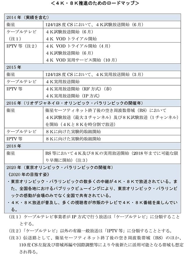 일본 총무성은 8월 29일 제3차 "4K-8K 로드맵 회의" 개최를 통해, 8K UHD(SHV)방송을 2016년에는 시험방송을 하고, 2018년에는 8K UHD본방송을 한다고 확정 발표를 하였습니다. 일본은 당초 2020년 동경올림픽 때, 8K UHD본방송을 한다고 하였으나, 계획을 2년 앞당겨 실시한다고 밝혔습니다. 그리고 일본은 2016년에 CS뿐만 아니라 BS 방송에서 4K 시험방송 및 8K 시험방송을 실시 할 방침이라고 밝혔습니다.
