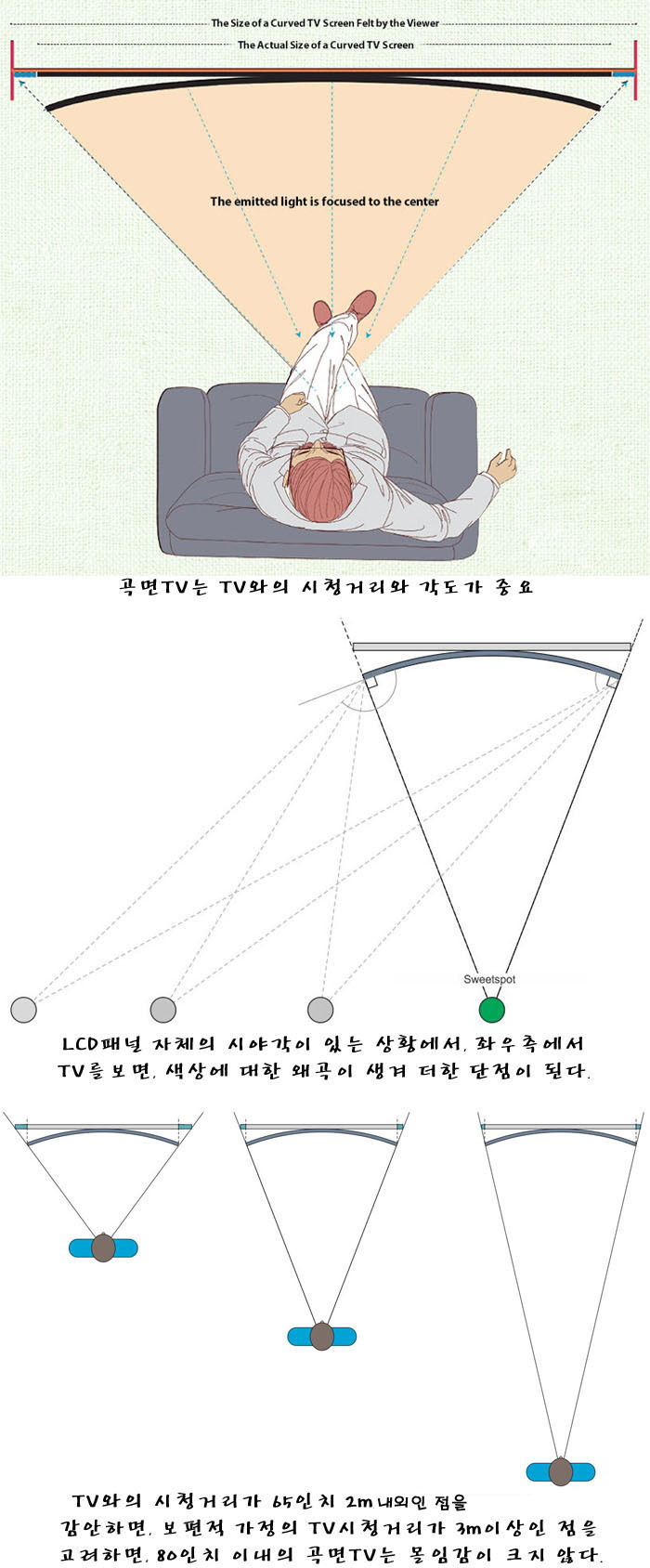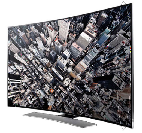 ▶곡면TV의 문제점과 단점(아래 그림 참조) 1.지정된 시청위치(거리-각도)가 아니면, 곡면TV의 몰입감은 크지 않다. 2.곡면TV의 대다수인 LCD(LED)는 좌우 측면에서 볼 때, 화질(색상) 왜곡이 더 생긴다. 3.곡면TV 뒷면 공간이 벙 떠서 디자인 측면에서 어색함이 있다. 4.가격이 평면TV보다 10~20%이상 비싸지만, 비싼만큼 효용성은 크지 않다.