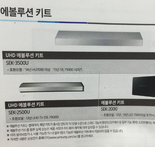 삼성이 지나 5월초 해외에서 내 놓은 2015형 에볼루션 키트(Evolution Kit/SEK-3500U)가 해외에서 인기라면, 국내 언론을 통해 보도자표까지 내 놓고, 제품 카다록에 까지 제품을 표기해 놓고도 2달이 지나도록 아직 이 제품을 내 놓질 못하고 있다. 2015년형 에볼루션 키트를 사용하면, 2013년 UHDTV와 2014년 UHDTV를 2015년 제품처럼 사용을 할 수 있다는 것이 삼성전자의 설명이다.