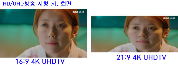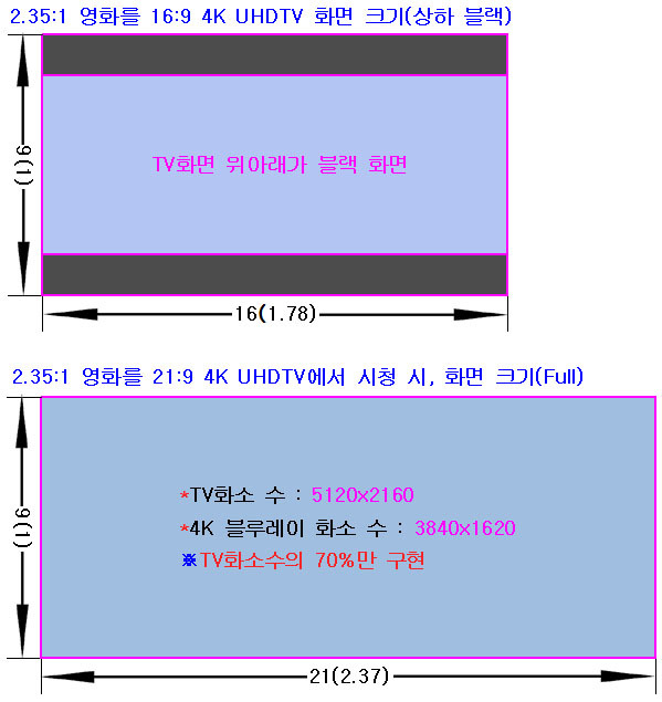 일부 블루레이(4K 포함) 영화 타이틀들이 16:9(1.78:1)화면비로 출시가 되어 16:9 4K UHDTV에서 화면이 Full로 나오는 경우도 있지만, 이런 경우는, 영화 원본 필름 영상의 좌우가 짤려서, 실제 70%의 영상만 담아내는 단점이 생긴다.