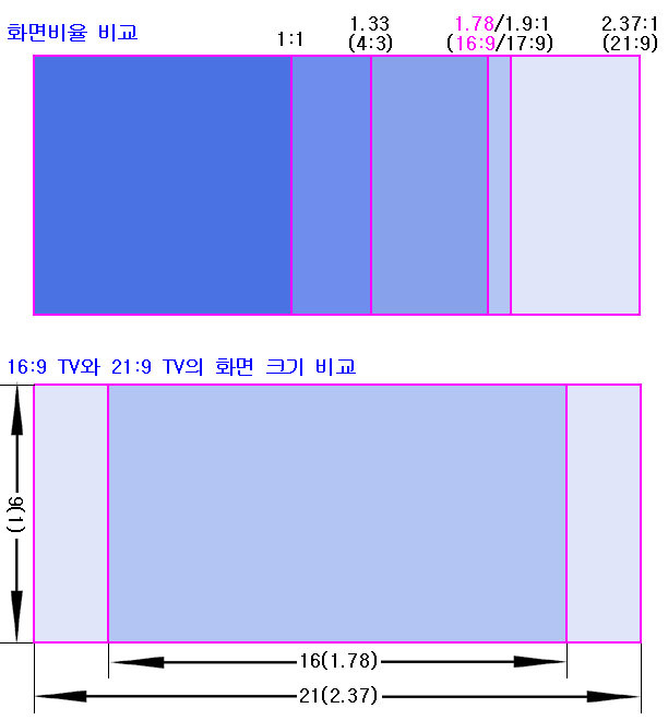 삼성-LG의 17년 출시 주력 스마트폰인 삼성 '갤럭시S8'과 LG 'G6'이 각각 18.5:9와 18:9 화면비를 갖춘 디스플레이를 적용한다고 하여 관심을 끌고 있은데, 삼성-LG가 화면비를 18:9~에 맞춘 이유는, 바로 스마트폰을 이용한 영화 감상이 늘고 있기 때문이다. 그런데, 컴퓨터 모니터는 이보다 더한 21:9모니터가 진즉에 등장을 하여, 주로 업무용에서 사용이 되어 왔지만, 최근에는 일부 TV에서도 영화 감상에 초점을 맞춘 21:9화면비를 갖춘 TV가 나오고 있다. 물론 21:9 TV가 등장한지도 2년여 정도 되었지만, 아직 TV용으론 대중화가 쉽지 않은 상황이다. 그렇지만, 관심을 가지는 분들도 제법 있어서, 21:9화면비의 TV에 대한 장단점을 살펴보았다. 만일 집에서 영화를 주로 본다면, 21:9화면비(5120x2160)에, 80인치 이상에 곡면, 그리고 정해진 위치에서 혼자만의 극장형태로 본다면, 괜찮은 TV라고 본다. 허나, 실상 가정에서 영화만을 주로 보는 경우가 흔치 않고, 또한 정해진 시청거리와 위치에서 TV를 본다는 것도 사실상 한계성이 있다. 특히 곡면TV라면, 곡면과 거실의 분위기가 조금은 어색하고, 또한 LCD(LED)형이라면, 빛샘과 시약각등은 감수를 해야 할 것이다. 그런데, 문제는 여기서 끝이 아니다. 영화의 경우를 한번 살펴보면, 영화 원본 필름의 화면비는 주로 1.85:1와 2.35:1이 대부분이다. 반면 TV 화면비는 1.78:1(16:9)이 99%이상인 상황에서 일부 1.9(17:9/모니터), 2.35:1(21:9)등이 있다.