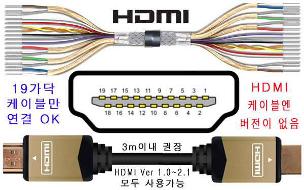 답댓글 작성자이군배 작성자 본인 여부 작성자 작성시간 17.07.26 19가닥의 선이 다 연결이 되어 있고, 케이블의 내선 품질만 이상 없으면(1만원 정도), 대다수는 4K UHDTV랑 연결해도 아무 문제가 없습니다.