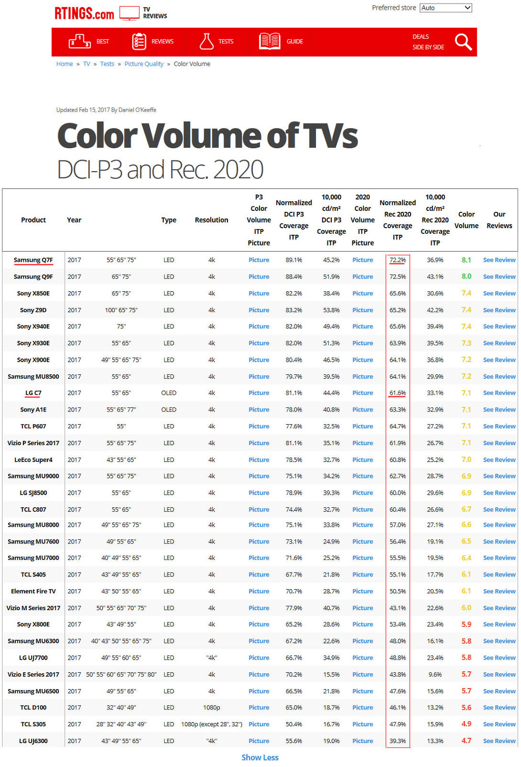 부제 : HDR이 UHD의 꽃으로 자리 잡으려면... TV의 화질에 대해 객관적으로 평가하는 것만큼 어려운 것도 없을 것이다. 특히 개인적 취향에 따라, 또는 시청하는 TV의 성능에 따라, 아니면 가지고 있는 TV의 화면 조정상태에 따라 TV의 화질은. 같은 방송을 시청하더라도 차이가 나기 때문에, 객관적인 화질 평가는 사실 존재할 수가 없다. 그래서 TV의 화질을 객관적으로 이야기할 수 있는 근거는, 바로 TV에 적용(최적화)된 표준 색상의 색 재현력 수준이다. TV에 적용(최적화)하는 표준 색상은, HDTV는 BT.709를, 디지털 영화는 DCI-P3를 적용하고, UHDTV는 BT.2020을 적용(최적화) 한다. 삼성-LG가 최고라고 내세우는 QLED TV와 OLED TV의 BT.2020의 색 재현력은 과연 얼마나 될까? 삼성은 2017년 출시 자사 QLED TV가 DCI-P3 100%를 구현한다고 자랑한다. 반면 LG는 OLED TV에 최적화된 컬러 볼륨은 공개하지 않고 있다. 다만, 어제 독일 IFA 2017에서 4K OLED TV에 "Technicolor"를 이야기하며, 원본에 가까운 컬러 구현을 한다고 하고 있다. 결국 삼성-LG 모두 최고의 화질을 구현한다면서, BT.2020 색 재현력은 표기하지 않고 있는 것이다. 즉, UHDTV의 화질을 객관적으로 알 수 있는 BT.2020에 대한 색 재현력을 표기하지 않는 것은, 양사 모두 BT.2020에 대한 색 재현력은 그다지 자신이 없기 때문이다. 그러한 증빙은, TV의 색 재현력 Test를 전문으로 하는 화사인 rtings사의 자료를 보면, 삼성-LG가 왜 UHDTV의 개관적인 BT.2020에 대한 색 재현력을 표기하지 않는지를 알 수 있을 것이다(아래 이미지 참조). 삼성 QLED TV인 경우, BT.2020 색 재현률이 70%약간 넘는 수준이고, LG OLED TV는 60% 약간 넘는 수준이다. 최근 들어 UHD화질에 대한 이야기를 하면서, 새롭게 추가되고 있는 객관적인 수치 자료가 또 하나 있다. 바로 HDR구현 nit와 HDR방식을 얼마나 지원하느냐이다. 해서 삼성-LG 4K UHDTV의 화질 구현 수준을 굳이 수치적으로 본다면, 아래와 같다.