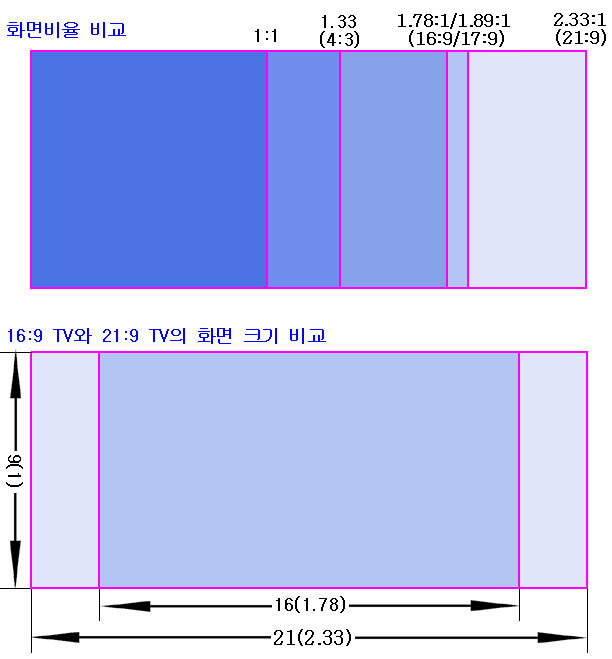 ☞16:9 TV를 선택하는 이유 4K TV(3840x2160)나 8K TV(7680x4320)를 구입하면 되는데, 대다수의 TV가 16:9에 맞추어져 있어, 선택에 어려움은 없다. ☞21:9 TV를 선택하는 이유 5K TV(5120x2160)나 10K TV(10240x4320)를 구입하면 되는데, 5K TV만 1~2종 정도 출시되어 있고, 10K TV는 언제 나올 수 있을지 알 수 없다. 다만, BOE가 2015년에 82인치 10K 디스플레이를 공개(Display Week) 한적은 있다. | |||||||||||||||||||||||||||||||||||||||||||||||||||||||||||||||||||||||||||||||||||||||||||