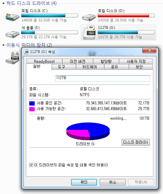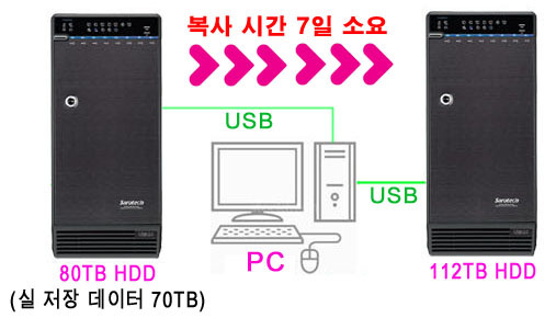 부제 : 대용량 저장 장치(DAS)는 안전한가? DAS(Direct-attached storage)는, 서버 또는 컴퓨터의 네트워크를 거치지 않고, 직접 연결되는 저장장치를 말하는 것으로, 여러 개의 HDD를 하나의 HDD처럼 묶어서 사용한다고 하여, 대용량 저장 장치라고도 부른다. 이번에 운영자는 기존 '80TB→112TB' HDD로 업그레이드(교체) 하였다. 1년여 만에 업그레이드 하는 것이지만, 기존 PC내장 80TB HDD에서, DAS 80TB HDD로 옮길때도 그랬지만, 이번에 DAS '80TB→112TB' HDD로 옮기는데만 꼬박 1주일이 걸려, DAS(112TB HDD)에 대한 검증은 1차로 충분히 검증이 되었다.