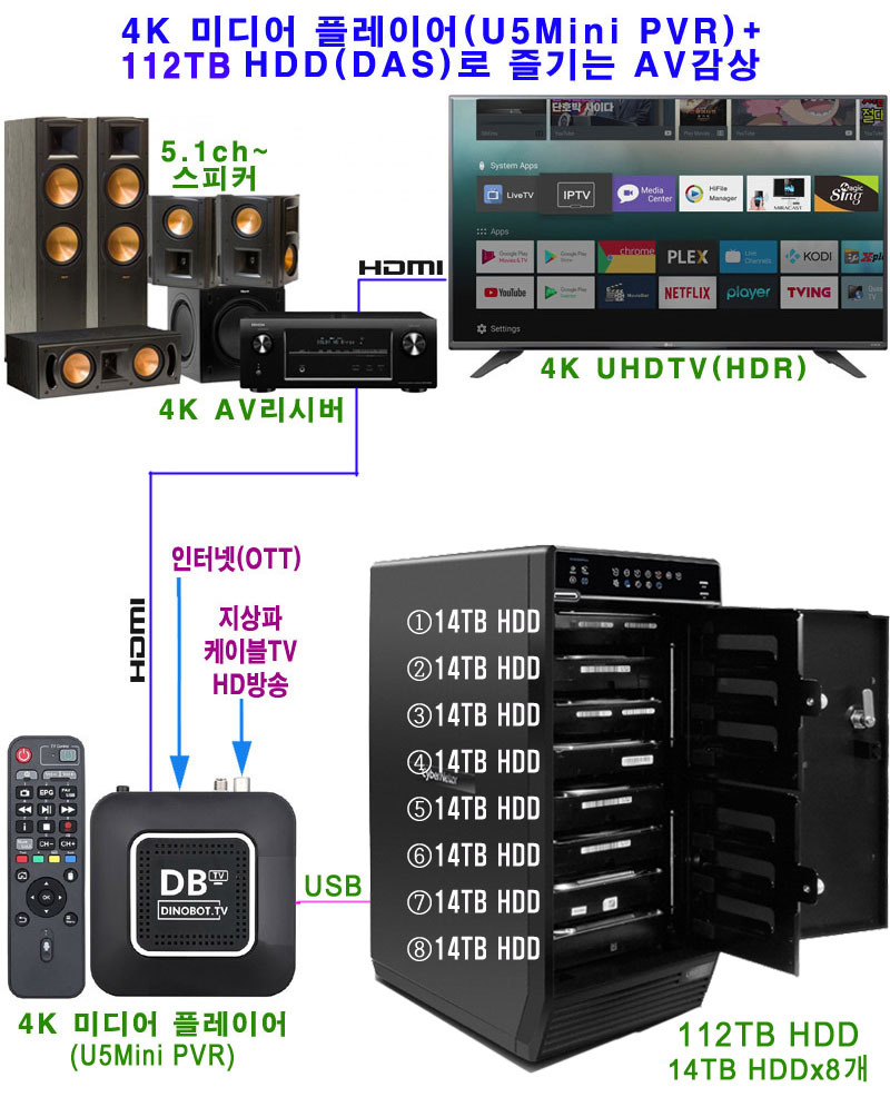 HDD는 물론 IT기기는, 대다수 발열이 고장의 1순위로 꼽힌다. 특히 HDD는 모터의 빠른 회전으로 발열이 심해, HDD고장의 최대 원인이 되고 있다. 해서 HDD의 발열만 잡아주면, HDD가 물리적으로 고장 날 확율은 거의 없다고 봐도 된다. 하지만, 우리들이 일반적으로 사용하는 HDD에는, CPU처럼 발열을 위한 팬(FAN)이 따로 없다. 해서 24시간 Full로 가동하면서, Data를 옮겼지만(7일), 2대의 HDD 발열은 미지근한 정도였다. 운영자가 사용한 HDD는 NAS용 7,200rpm HDD여서 발열이 더욱 높다. 대다수의 HDD는 5400rpm 이거나 5,900rpm이지만, NAS용 HDD는 7,200rpm이여서 발열이 더욱 높다. 하지만, 기본 2개의 팬에, 추가로 2개를 달아주면, 7,200rpm HDD라 해도, 발열은 거의 없다. 많은 분들이 외장 HDD 하나쯤은 사용을 한다. 하지만, 외장 HDD케이스에 HDD의 발열을 잡아주기 위한 팬은 별도로 없는 경우가 다반사이다. 그런 HDD를 만져보면, HDD가 상당히 뜨겁다(여름철은 손도 못댈 정도로 뜨겁다). 또한 외장 HDD 사용시에, 전원을 Off 해서, 곧바로 HDD를 옮기는 경우가 많다. 하지만, HDD의 전원을 Off 한다고 해도, 5400rpm~ 속도로 돌던 모터가 멈추는 데는 20초 정도의 시간이 걸린다. 이런 외장 HDD를 곧바로 움직이면, HDD의 안정성은 점점 약해진다. 또한 외장 HDD를 AV기기 옆에 놓으면, 소리의 진동으로 인해, 미세한 진동이 HDD로 전달이 되어, HDD의 안정성을 저해한다. 하지만, DAS는 별도로 바닥에 놓고, 또 기본적인 무게로 인해, HDD이동이 거의 없어, 오히려 HDD의 안전성은 일반 외장 HDD보다 높다. 문제 될 것은 사용자의 과실이다. PC랑 연동하여, 바이러스 등으로 Data가 유실 되는 것만 주의해 준다면, DAS의 안정성은 크게 우려하지 않아도 된다. 그렇지만, 기기이기에 만에 하나 고장이 날 경우를 대비해, 동호회원들 간 정보 교류를 통해, 만에 하나 발생할 수 있는 고장에 대비를 한다. ☞대용량 저장장치(112TB) 사용에 따른 우려 1.일시에 구입해야 하는 HDD비용이 부담된다. (장기적인 관점에선 더 저렴하게 AV를 지속해서 즐길 수 있다) 2.대용량 저장 장치(64TB~)에 담아서 볼 AV소스 확보가 쉽지 않다. (카페 동호회 활동 등을 통해 회원들 간 정보 교류) 3.대용량 저장 장치(64TB~) 고장으로 인한 AV소스 유실 (카페 동호회 활동 등을 통해 회원들 간 친목으로 유실된 AV소스 복구) (대용량 저장 장치 고장 원인→HDD발열→HDD발열만 잡으면, HDD고장 가능성은 사실상 "O"→안정성을 위해 전면 90mm팬x2개 추가 장착) (지난 8년간 20여명의 DAS사용자 중, HDD고장으로 데이터 유실 사례 X) ☞대용량 저장 장치 사용에 따른 운영자의 조언 한번에 다소 큰 돈을 들인다는 부담은 있지만, 잘만 운영하면, 오히려 저렴하게(장기적 관점) 최고의 화질과 음향으로 AV를 감상하는 것을 지속해 나갈 수 있는 유일한 대안이 아닌가 싶다. DAS(대용량 저장 장치)는, 직접 사용해 보기 전에는 그 이점을 느끼기가 힘들기 때문에, 대용량 저장 장치(64TB~)에 괌심이 있으신 분들은, 운영자 메일(daumlgb@hanmail.net)이나 쪽지로 연락 이유는 U5Mini PVR 하나면, 음악 파일부터 사진, 동영상, 그리고 TV시청, 인터넷을 이용한 동영상까지 모두 이용이 가능하다. 즉, AV감상을 간단하면서 편리하게, 그렇지만, 최적의 화질과 름질로 AV를 감상하고 있습니다. ▶U5Mini PVR 주요 특장점 ☞4K 미디어 플레이어+HD방송 수신녹화기 1.OS : 안드로이드 TV 7.0 2.4K UHD영상 재생 코덱→HEVC(H.265), AVC(H.264), VP9등 3.4K UHD HDR지원→HDMI출력(HDR10/HLG) 4.지상파/케이블TV, HD방송 시청&녹화 *2개 튜너→1ch(즉시 또는 EPG예약)녹화, 1ch 수신(시청) 예)KBS2 녹화, SBS시청 *지상파/케이블TV, HD방송 Up시청(1080@60i→2160@60p Up) *EPG/자막 지원 *지상파/케이블TV, HD방송(8VSB) 수신(70여 채널)및 원본그대로 녹화 ※녹화한 영상은, 다른 재생기에서도 재생 가능 ※제가 거주하는 지역은 케이블TV UHD(4K)방송 수신제한이 걸려있지 않아, 케이블TV UHD방송도 U5Mini PVR로 수신 녹화(원본동일)가 가능합니다. 5.유튜브(Youtube)/넥플릭스(Netflix) 4K동영상 4K로 재생 6.블루레이/4K블루레이 원본(폴더/ISO) 재생 *블루레이 2D/3D 자동재생 *정품 블루레이/4K블루레이 리핑소스(폴더/ISO) 네비게이션(메뉴방식) 7.음성인식 기능+마우스 기능 리모컨으로 좀 더 편리하게 사용 8.기타 특장점 *HD오디오(Dolby TrueHD/DTS HD/LPCM) 패스쓰루(Pass Through) *UHD오디오(Dolby Atmos/DTS:X) 패스쓰루(Pass Through) *USB키보드/마우스 지원으로 PC처럼 인터넷 검색 등을 할 수 있음. *각종 안드로이드 앱(TV용) 사용 가능 *소비전력 : 13W내외 ▶U5Mini PVR만의 특장점을 활용한 AV감상 ☞U5Mini PVR만의 장점인 블루레이 메뉴방식 재생이 필요한 이유 1.원본과 동일하게(메뉴방식 재생) 재생할 수 있다. (단, 블루레이 원본 리핑 소스가 있다는 전제) 1)원본과 동일한 화질-음질로 감상이 가능하다. 2)제작후기와 같은 부가영상을 이용할 수 있다. 3)디스크 한 장에 연속으로 이어진 영상을 순서대로 재생이 가능하다. 4)원본에 있는 다양한 오디오와 자막을 다양성 있게 활용할 수 있다. 2.블루레이 플레이어 보다 편리한 기능 2)홍보 광고나 경고 안내문 같은 것을 보지 않고, 곧바로 영화 본편 감상이 가능하다. 3)자막 없는 정품 타이틀을 리핑하여, 손쉽게 