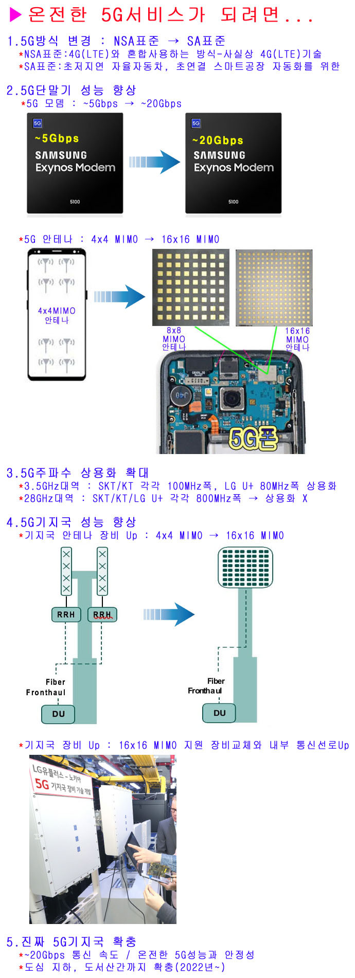 아직도 5G에 대한 장밋빛 전망과 과도한 홍보가 이어지고 있다. 5G 끊김이나 5G가 터지지 않는 문제에 대해선, 지적은 하면서도, 그에 따른 가입자들에 대한 보상이나 요금면제와 같은 것들은 없다. 초기이기에 있을 수 있는 문제라며, 모두 가입자들의 못으로 떠넘기고 있다. 이에 반해, 우리와 2시간 차이로 5G 상용서비스를 늦게 실시한 미국의 버라이존은, 5G가 안정화되기 전까지는, 5G이용료를 받지 않겠다고 한다. 같은 5G 서비스를 하면서도, 우리와는 달라도 너무 다른 고객중심의 조치다. 헌데, 더 큰 문제는 지금 불안정한 5G가 안정화 된다고 하여, 5G 성능을 이용할 수 있는 것은 아니다. 적어도 1~2년 안에는 진짜 5G 성능은 이용하기 힘들다. 이유는, 현재 삼성-LG가 공급하는 5G폰은, 아무리 빨라봐야 ~3Gbps를 넘기 힘든 5G폰이기 때문이다. 즉, 5G폰에 내장된 5G모뎀이 ~5Gbps까지밖에 안 나오고, 내장 안테나가 4G(LTE)와 같은, 4x4 MIMO안테나를 사용하고 있어, 통신 속도가, 4G(LTE)로 1Gbps, 5G로 ~1.5Gbps 정도 나오는, 5G의 성능은 없고, 단순 통신 속도만 조금 빨라진 그런 5G폰이기 때문이다. 설사 5G폰의 성능이 좋아진다 해도, ~20Gbps나온다는 5G통신 속도는 나오지 못한다. 이유는, 기지국에 설치한 5G정비들도 아직 ~3Gbps,도 나오기 힘든 장비들로 되어있기 때문이다. 해서 진짜 5G가 되려면, 5G폰과 5G기지국내 5G장비까지 모두 업그레이드(교체)가 불가피한 실정이다. 그럼 5G폰은 어떻게 업그레이드(교체)가 되어야 할까? 우선 5G폰에 내장된 5G모뎀이 ~20Gbps까지 나오려면, 5G폰에 내장되어 있는 5G모뎀의 성능이 향상 되어야 하는데, 지금의 기술로는 불가능하다. 적어도 1~2년은 더 걸릴 것으로 보인다. 5G폰에 내장되어 있는 안테나도 향상되어야 하는데, 현재 5G폰에 내장된 4x4 MIMO안테나가, 16x16 MIMO 안테나로 바뀌어야 한다. 이 또한 처럼 쉽지 않다. 아직 내장할 만한 소형 16x16 MIMO 상용 안테나가 없다. 지난 4월 25일, 삼성전기가 세계 최소형 5G 안테나 모듈을 개발했다는 보도가 있었지만, 이것이 16x16 MIMO를 지원하는지는 아직 확인이 안 되고 있고, 설사 16x16 MIMO를 지원한다 해도, 이 안테나가 5G단말기 제조사에 보급이 되어, 적합성 데스트까지 거쳐 상용화 되려면, 적어도 1~2년의 시간이 더 필요하다. 이처럼 5G폰의 성능이 향상되더라도, 5G기지국의 안테나와 장비들이 향상되지 않는다면, 공염불이 된다. 현재 5기지국에 사용된 안테나는 4G(LTE)와 같은 4x4 MIMO안테나에 장비도 3.5GHz대역의 80~100MHz폭만 상용화하여, 사실상 4G(LTE)와 같은 구조로 운영되는 NAS표준방식을 사용하고 있다. 즉, 기존 4G(LTE)와의 호환성(~80MHz폭)에 3.5GHz대역의 80~100MHz폭만 추가하여, 5G통신 속도가 ~1.5Gbps도 나오지 못하고 있는 것이다. 해서 무늬만 5G라는 말이 나오고 있는 것이다. 현실이 이러니, 5G통신 속도가, 기존 4G(LTE)랑 비슷하게 나오는 것이고, 또한 5G성능은 하나도 이용할 수 없는 것이다. 즉, 4G(LTE)+5G의 통신 속도가 합쳐져서, 겨우 ~2.5Gbps정도의 통신 속도만 나와, 조금 빨라진 그런 5G가 되고 있는 것이다. 그럼 진짜 5G가 나오려면, 어떻게 해야 할까? 즉, 5G 통신 속도(20Gbps)가 나오고, 자울주행차와 연동을 하려면, 아직 상용화 하지 못한 28GHz대역의 800MHz폭의 주파수를 상용화 해야만, 초저지연 원격 의료, 초연결 스마트공장 자동화 등이 가능하다. 허나, 28GHz대역의 800MHz폭의 주파수를 상용화 하려면, 아직도 1~2년은 더 있어야 가능할 것으로 보인다. 결국 28GHz대역의 800MHz폭이 상용화 되고, 5G폰의 5G모뎀이 ~20Gbps까지 나오고, 또한 16x16 MIMO안테나 기술이 5G폰에 적용이 되고, 기지국도 ~20Gbps까지 나오기 위한 SA표준방식으로 장비나 안테나(16x16 MIMO)가 모두 갖추어 져야만, 진정한 5G의 성능이 나오는 것이다. 해서 이러한 것들이 모두 안정화되어, 일상화되기까지는 앞으로 최소 2~3년의 시간이 더 필요 할 것으로 보인다. 이러한 현실은, 5G 주도권을 놓고 경쟁을 벌이는 한국은 물론, 미국, 중국, 일본도 비슷하게 겪고 있는 난제들이다. 해서 대다수의 나라들이 아직 5G 상용화는 2020년 이후로 잡고 있고, 중국과 미국만 일부 통신사만 시범적으로 조심스럽게, 5G상용화를 해나가고 있는데, 우리만 너무 성급하게, 세계최초에 함몰되어, 통신3사가 일시에 전국적으로 하고 있다 보니, 그 후유증이 더 큰 것이다. 그리고 5G에 대한 기술은, 특정 국가, 특정회사가 모두 가지고 가기는 힘들다. 서로 얽히고 섞여서, 상호 보완 없이는 독단적으로 5G를 할 수도 없다. 또한 5G를 주도하고 있는 한국, 미국, 중국, 일본은, 모두 자국산 5G장비 사용을 권하고 있어, 국내업체들의 5G장비 수출 길도 그리 녹록하지 않은 실정이다. 특히 한국을 제외한 미국이나 중국, 일본은, 자국내 시장 기반이 있어, 5G에 대한 수출이 다소 부진해도, 큰 문제가 없지만, 국내의 경우는, 국내 시장 기반이 한정되어있어, 제3국을 뚫어야 하는데, 시간이 갈수록 이 부분에서도 한국이 약세를 보이고 있다는 것이다. 해서 국내 업체들이 5G에 대해, 진짜 강국이 되려면, 과도한 홍보보다는, 기술(성능)과 안정성을 답보로 하는 그런 5G를 구축해야 한다. 지금처럼, 무늬만 5G를 가지고, 또 서비스에 문제가 있는데