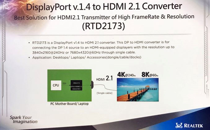 HDMI 2.1(48Gbps)를 지원하는 재생기 출시가 지연이 되면서, 삼성-LG 8K TV가 사실상 무용지물이 되고 있다. 해서 일각에서는 삼성-LG 8K TV에 DisplayPort 1.4 DSC를 적용해서, 출시해야 한다는 지적이 잇따르고 있다. 삼성-LG 8K TV가 DisplayPort 1.4 DSC를 적용하면, PC랑 8K/60Hz, 10bit/4:2:0까지 연동이 가능하여, 8K TV로서 기능을 못하는 8K TV를 활용할 수 있기 때문이다. 하지만, TV에 DisplayPort단자를 내장하는 경우가 흔치 않고, 또한 PC용 비디오카드가 년 내에는 HDMI 2.1(48Gbps)를 지원해서 출시가 되기 힘들어, 비디오 칩셋을 전문으로 만드는 Realtek사가 의미 있는 칩셋을 발표하여, 관심을 모으로 있다. 즉, Realtek은, 지난 6월에 RTD2173 칩셋을 공개하면서, 'DisplayPort 1.4→HDMI 2.1' 변환기에 대한 시연을 진행하였다. Realtek은 이날 시연 자료를 통해, 자사의 'DisplayPort 1.4→HDMI 2.1' 변환기가, 3840×2160@240Hz와 7680×4320@60Hz를 지원한다고 발표하였다. 하지만, Realtek의 주장은, 실제 상품이 나와서 검증을 해봐야 정확한 성능을 알 수 있을 것 같다. 이유는, DisplayPort 1.4의 기본 전송량은 32.4Gbps다. 반면 HDMI 2.1의 기본 전송량은 48Gbps다. 해서 변환기의 기본 전송량은 32.4Gbps를 넘지 못한다.