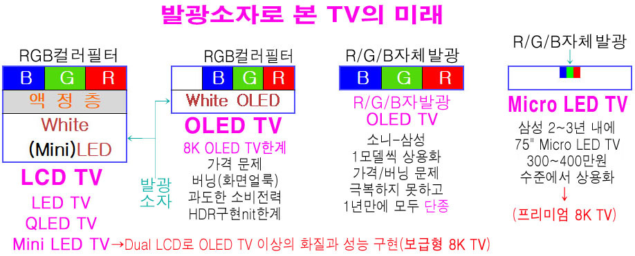 두 제품의 화질 우위성은 물어볼 것도 없이 88" 8K Micro LED TV가 우세할 것이다. 하지만, 88" 8K Micro LED TV는 아직 상용화가 안 되어, 변수가 많다. 특히 가격이 제일 큰 변수다. 물론 88" 8K OLED TV도 아직 가격이 초고가다. 2~3년 후에 LG가 10.5세대에서 수율을 개선해서 내 놓는다고 해도, 88"정도면 2천만원은 넘을 것으로 보인다. 그리고 1KW가 넘는 소비전력 문제를 비롯하여, 250nit를 넘지 못하는 HDR구현nit, 버닝문제등도 아직 해소되지 않았다. 반면 88" 8K Micro LED TV는, 일부 기술적 문제가 있지만, 현재로선 가격문제만 극복하면 된다. 그리고 OLED TV는, 사실상 LGD외에는 거의 뛰어든 기업이 없지만, Micro LED TV는 대다수의 TV제조사(10여개사~)들이 뛰어들고 있어, 적어도 2~3년 안에는 가시적인 성과가 나올 것으로 보인다. 해서 차기 TV는 OLED보다는 Micro LED가 훨씬 경쟁력이 있다고 보는 것이다. | ||||||||||||||||||||||||||||||||||||||||||||||||