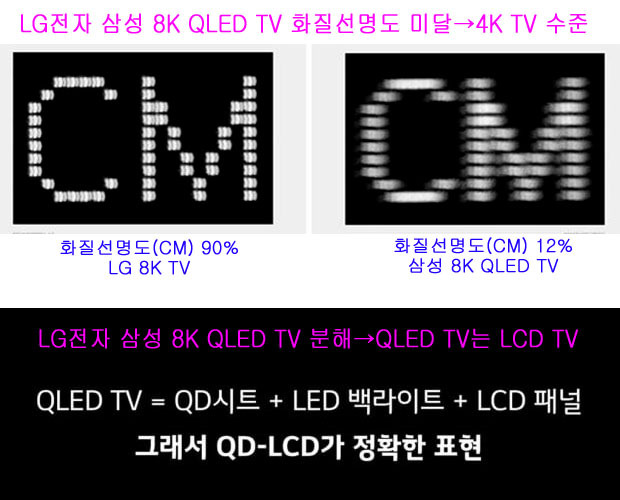 2019년 9월 20일, LG전자는 백라이트가 있는 삼성전자 ‘QLED TV’ 표시·광고 행위가 거짓·과장 광고에 해당한다며 공정위에 신고(제소)한 바 있다. 그러자 바로(10월 21일) 삼성전자는 자사의 QLED TV에 대해 객관적 근거 없이 비방했다며 LG전자를 공정위에 신고(제소)했다. 이후 삼성-LG는 이달에 공정위에 신고한 것을 취하면서, 공정위는 삼성-LG가 신고한 것에 대한 심사절차를 종료한다고 6월 5일 밝혔다. 헌데 문제는, 양사가 이번 심사 종료에 대해, 각자의 입장에서 자신들에게 유리한 입장만을 이야기 하고 있고, 언론들도 "진흙탕 싸움 8K TV '공방' 일단락", "TV전쟁 휴전”, "승자도 패자도 없이 끝났다", "LG의 승리", "삼성의 승리"등 제각각의 해석을 내 놓았다. 하지만, 소비자 입장에선 세계 1~2위 TV제조사들이 벌인 이번 공정위 제소는, 삼성-LG의 전형적인 노이즈 마케팅으로밖에 보이지 않아, 실망감만 더욱 크다. 소비자들이 이처럼 실망감이 더 커진 이유는, 2020년 출시 삼성-LG 8K TV 성능이 그것을 말해주고 있기 때문이다. 즉, 2020년 출시 삼성-LG 8K TV애서 화질선명(CM) 표기는 찾아 볼수 없고, 또한 화질선명도(CM)를 표기하며, 제품을 판매하는 다른 TV제조사들도 없다라는 것이고, 무엇보다 CTA나 8KA에서 인증하는 '8K UHD'인증을 받았다는 삼성-LG 표기도 없고, 또한 다른 TV제조사들은 아예 '8K UHD'인증 자체를 받고 8K TV를 출시한 사례가 없다라는 것이다. 논란이 된 것들이 삼성-LG만의 문제 였고, 그들만의 싸움이었다는 것이다. 삼성-LG의 공정위 맞제소 시발은, 2019년 9월 IFA 2019에서 LG가 "삼성 8K QLED TV가, ICDM 화질선명도(CM) 측정기준에, 자사 8K TV는 90%인데, 삼성 8K QLED TV는 12%로 나와 8K TV로는 부족함이 있다"라고 주장하면서 시작이 되었고, 이후, 삼성이 LG의 주장에 반격을 가하자, LG는 삼성 QLED TV는, LCD패널을 사용하여 백라이트로 발광하는 TV인데, QLED TV라고 표기하여, OLED TV처럼 자체발광하는 TV로 소비자를 오도한다며, 공정위에 신고를 한 것이다.