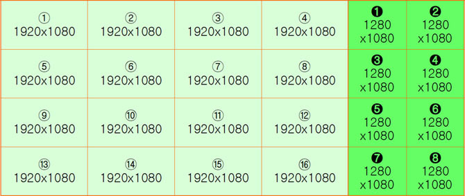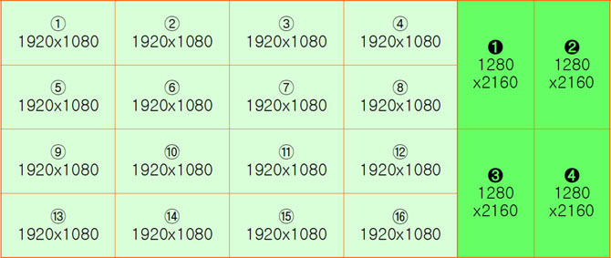 ⓐ+ⓒ-2> 2K(1920x1080)모듈 16개(4x4)+1280x2160용 모듈 4개(2x2)로 구성한 8K(16:9)↔10K(21:9) Micro LED TV ==> 총 20개 모듈 사용 ☞화면(모듈) 구성