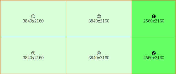 ⓑ+ⓒ-3> 4K(3840x2160)모듈 4개(2x2)+2560x2160용 모듈 2개(1x2)로 구성한 8K(16:9)↔10K(21:9) Micro LED TV ==> 총 6개 모듈 사용 ☞화면(모듈) 구성