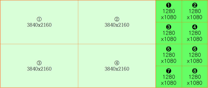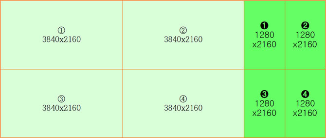 ⓑ+ⓒ-1> 4K(3840x2160)모듈 4개(2x2)+1280x1080용 모듈 8개(2x4)로 구성한 8K(16:9)↔10K(21:9) Micro LED TV ==> 총 12개 모듈 사용 ☞화면(모듈) 구성