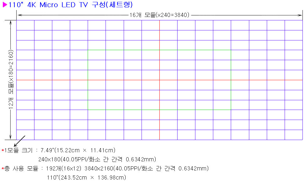 이렇게 8K↔10K Micro LED TV를 구성하였다면, 소비자들은, 지금과는 조금 다른 콘트롤 박스로 8K↔10K Micro LED TV를 활용할 수 있을 것이다. 물론 기존처럼 방송 시청은 내장 튜너나 인터넷망을 이용하거나, 유료방송 세톱박스를 이용해서, HDMI로 방송을 8K(16:9) Micro LED TV로 시청하면 될 것이다. Micro LED TV에 대한 이런 고민은, 앞으로 Micro LED TV를 100"미만으로, 그것도 8K로 만든다면, 더한 고민에 쌓일 것이다. 즉, 100"미만 8K Micro LED TV를 만들려면, 화소 간 간격을 0.4mm를 넘어 0.2mm대까지 실현을 해야 하기 때문에, 상당한 어려움이 예상된다. 해서 이번에도 삼성이 2년 전부터 출시를 예고한 75" 4K Micro LED TV"(화소간 간격 0.4mm대)를 출시하지 못한 것으로 보인다. | |||||||||||||||||||||||||||||||||||||||||||||||||||||||||||||||||||||||||||||||||||||||||||||||||||||||||||||||||||||||||||||||||||||||||||||||||||||||||||||||||||||||||||||||||||||||||||||||||||||||||||||||||||||||||||||||||||||||||||||||||||||||||||||||||||||||||||||||||||||||||||||||||||||||||||||||||||||||||||||||||||||||||||||||||||||||||||||||||||||||||||||||||||||||||||||||||||||||||||||||||||||||||||||||||||||||||||||||||||||||||||||||||||||||||||||||||||||||||||||||||||||||||||||||||